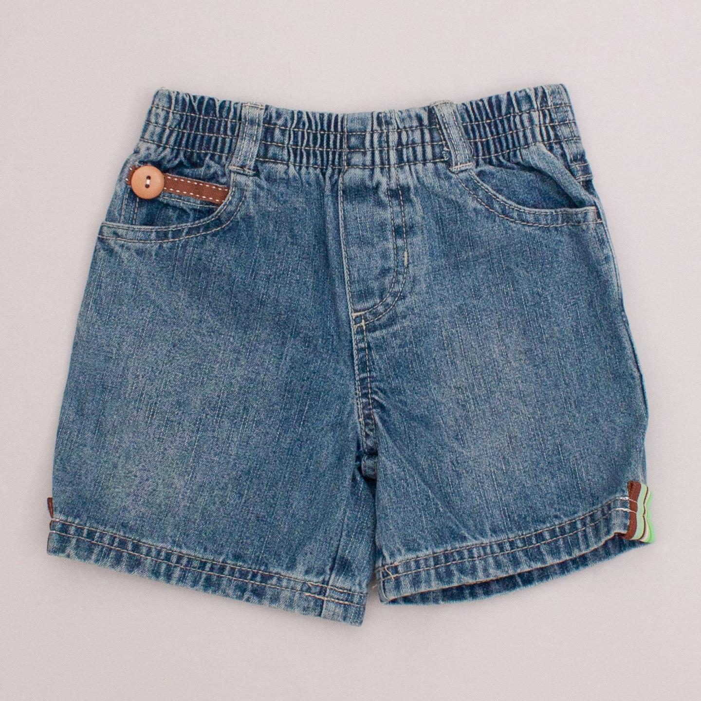 Innocent Prints distressed denim shorts with front and back pockets, green stripe detailing, elastic waistband and belt loops