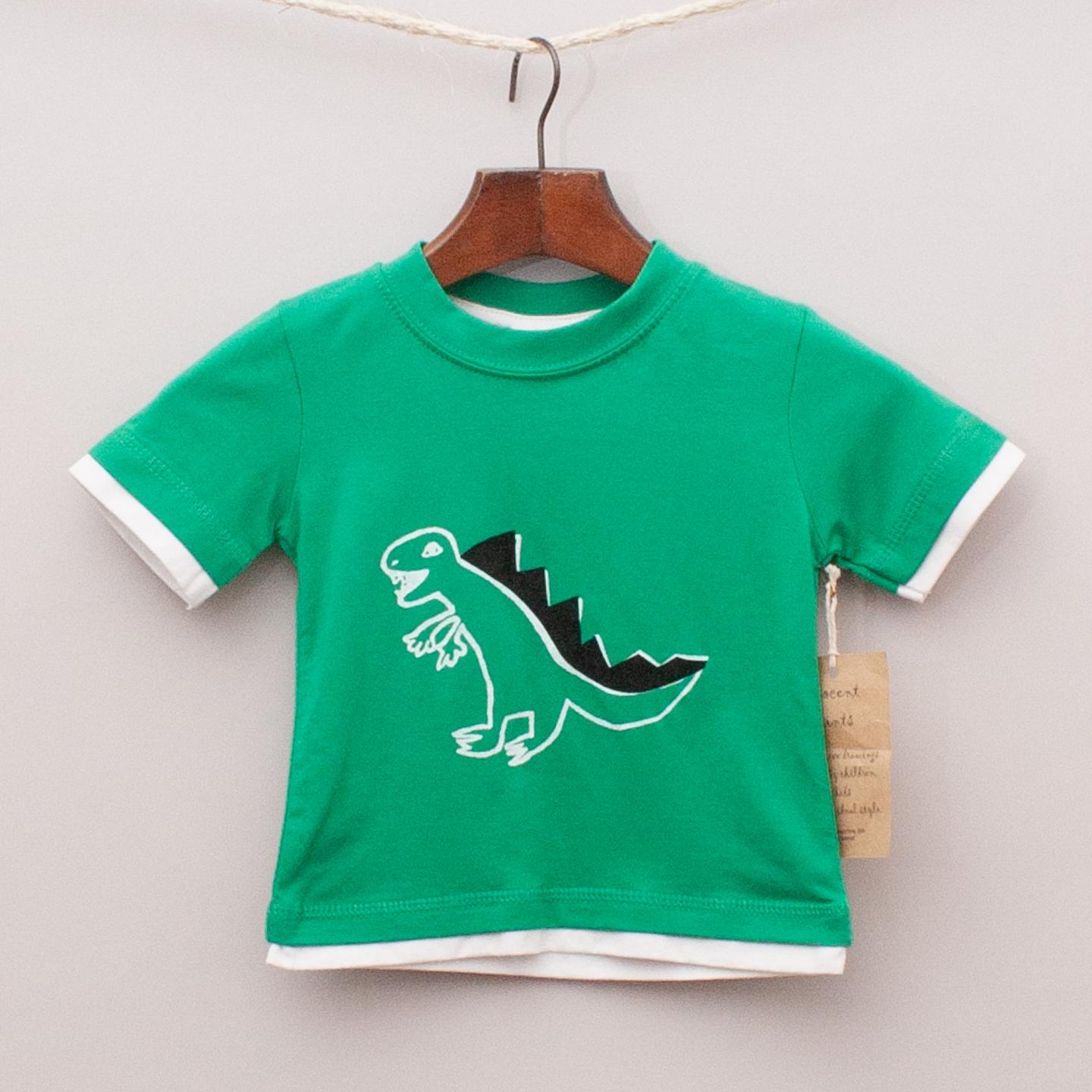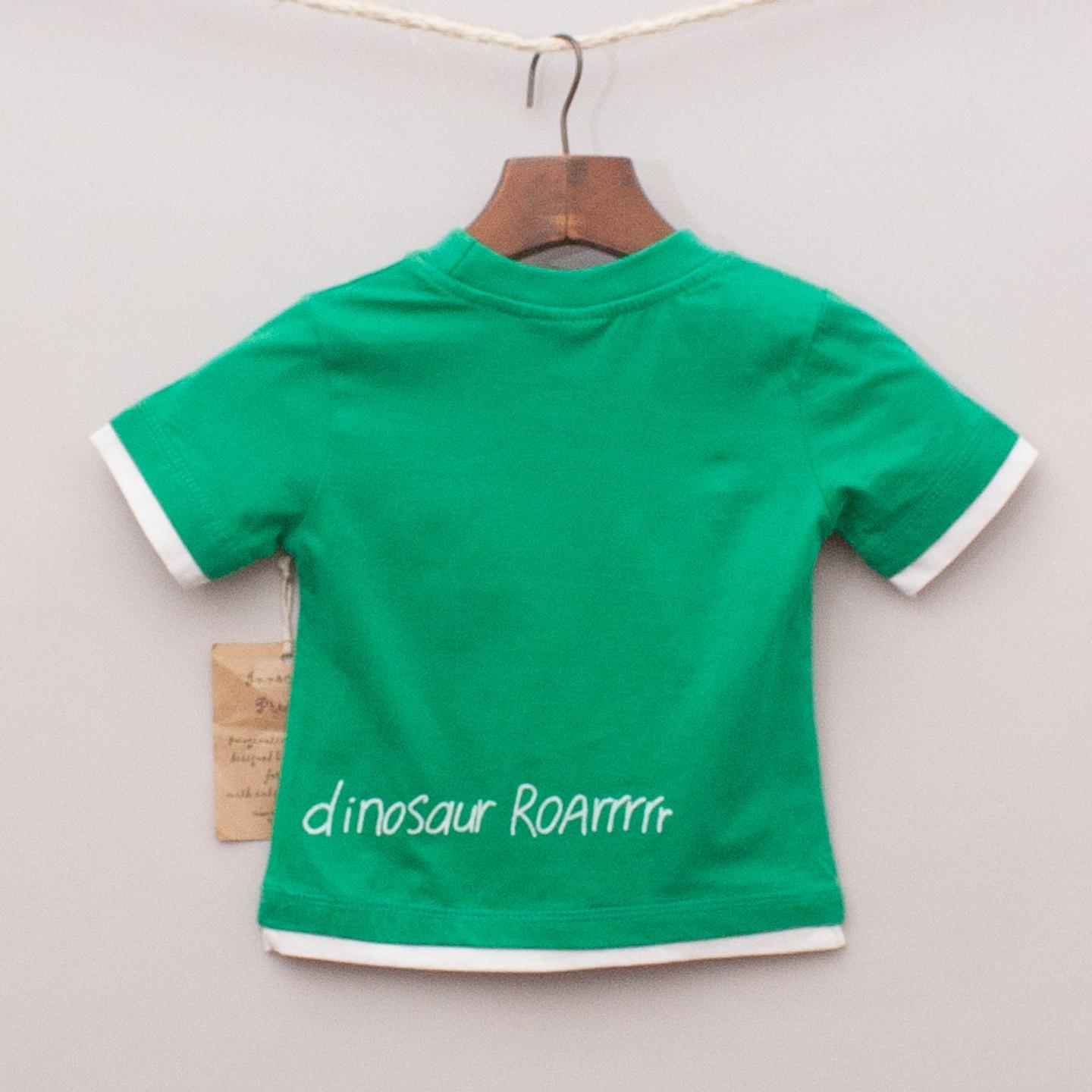 Innocent Prints "brand new with tags" green t-shirt with white underlay and dinosaur printed on the front