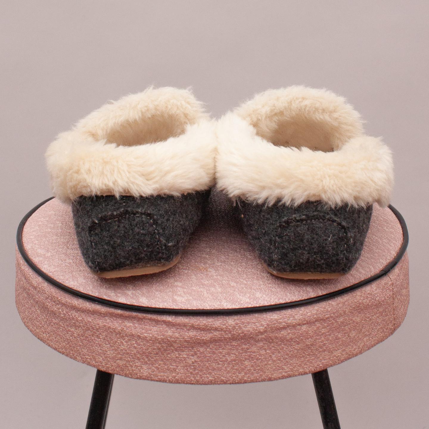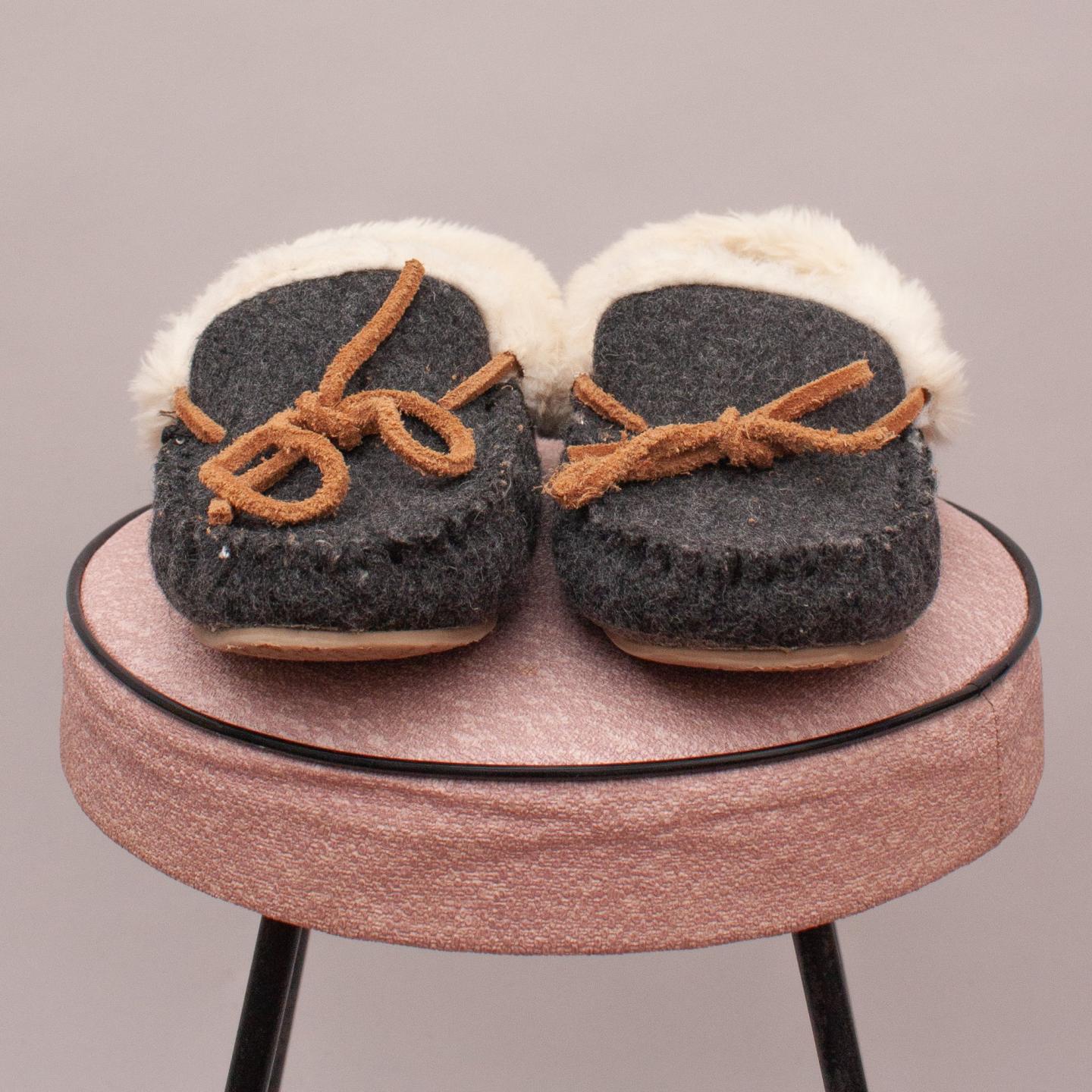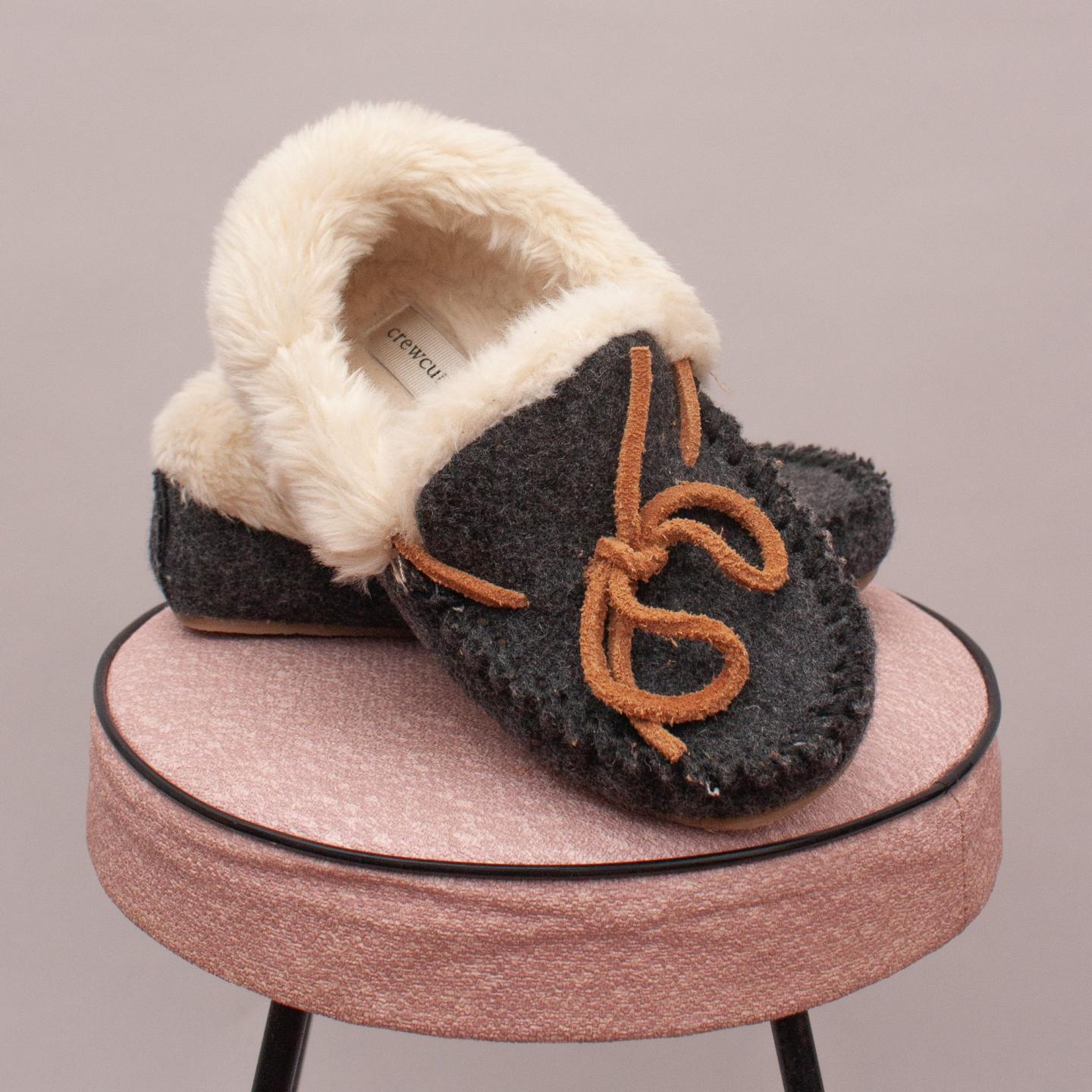 J Crew "brand new without tags" dark grey moccasins with brown tie on the front, fuzzy inside and rubber soles - Size EU 31 (Age 6 Approx.)