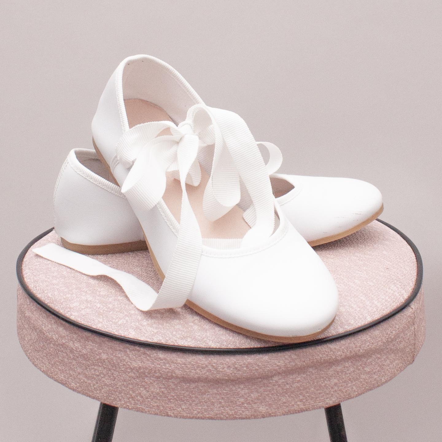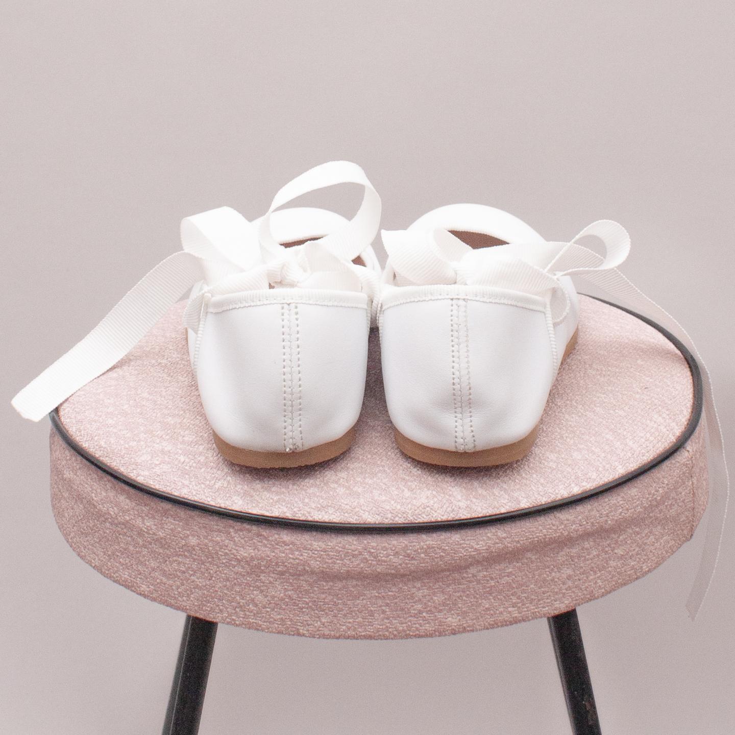 Jacadi (in box) white leather ballet style shoes with ribbon ankle tie and think rubber soles - Size EU 29 (Age 5 approx.) *Some very light pink staining around the toe and ribbon could be replaced - plenty of life left