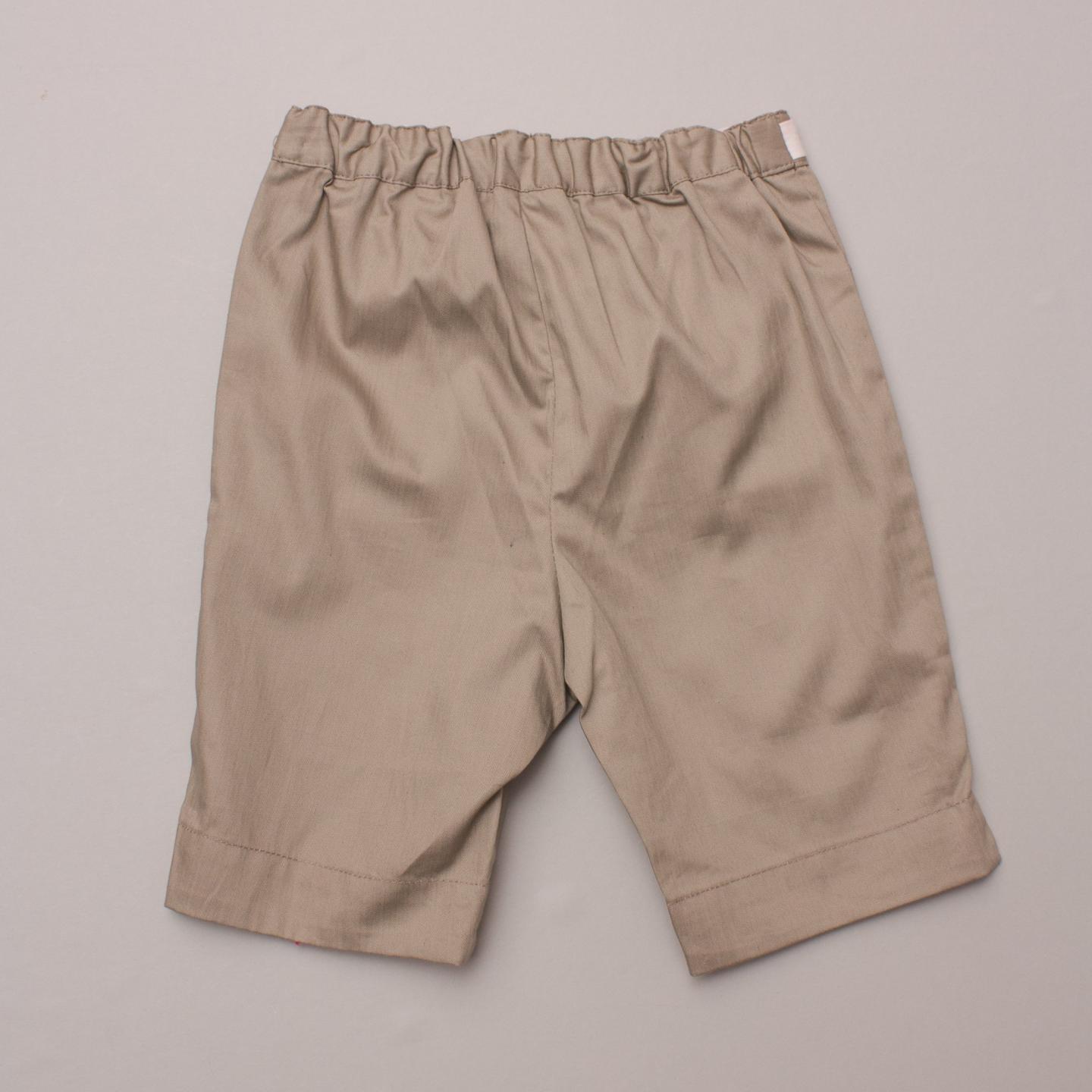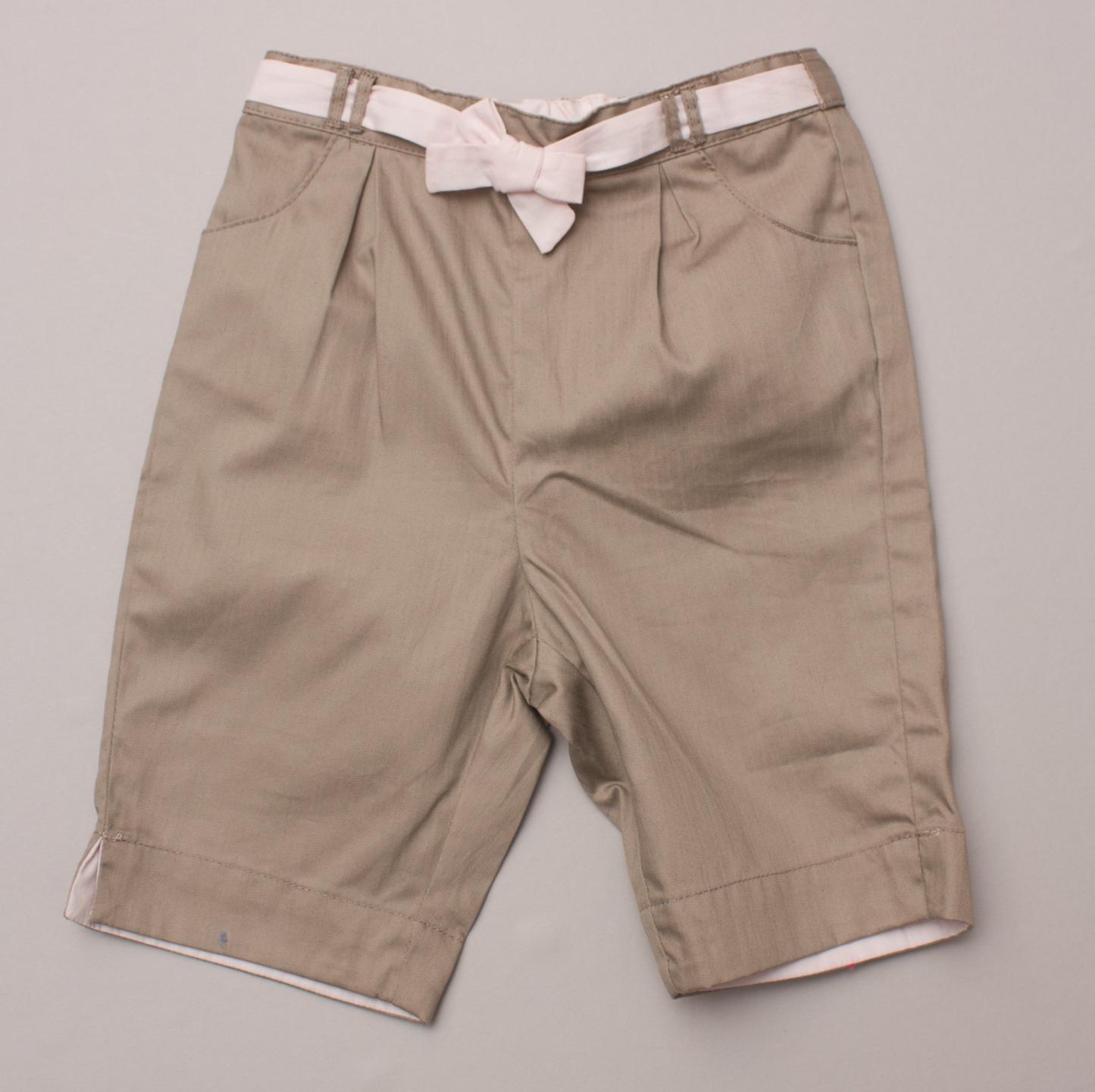 Jacadi light brown pants with two front pockets, pastel pink accents with bow detail and elastic waistband