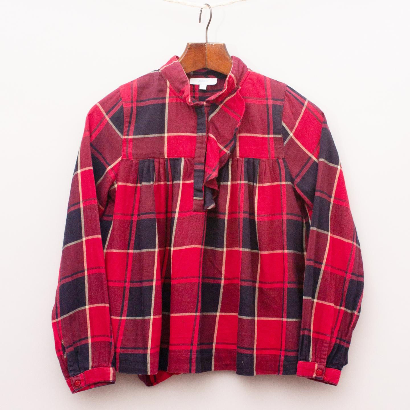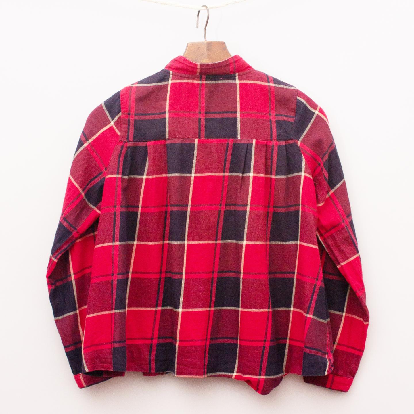 Jacadi red and black plaid shirt with flowy style, ruffle detail and button down front