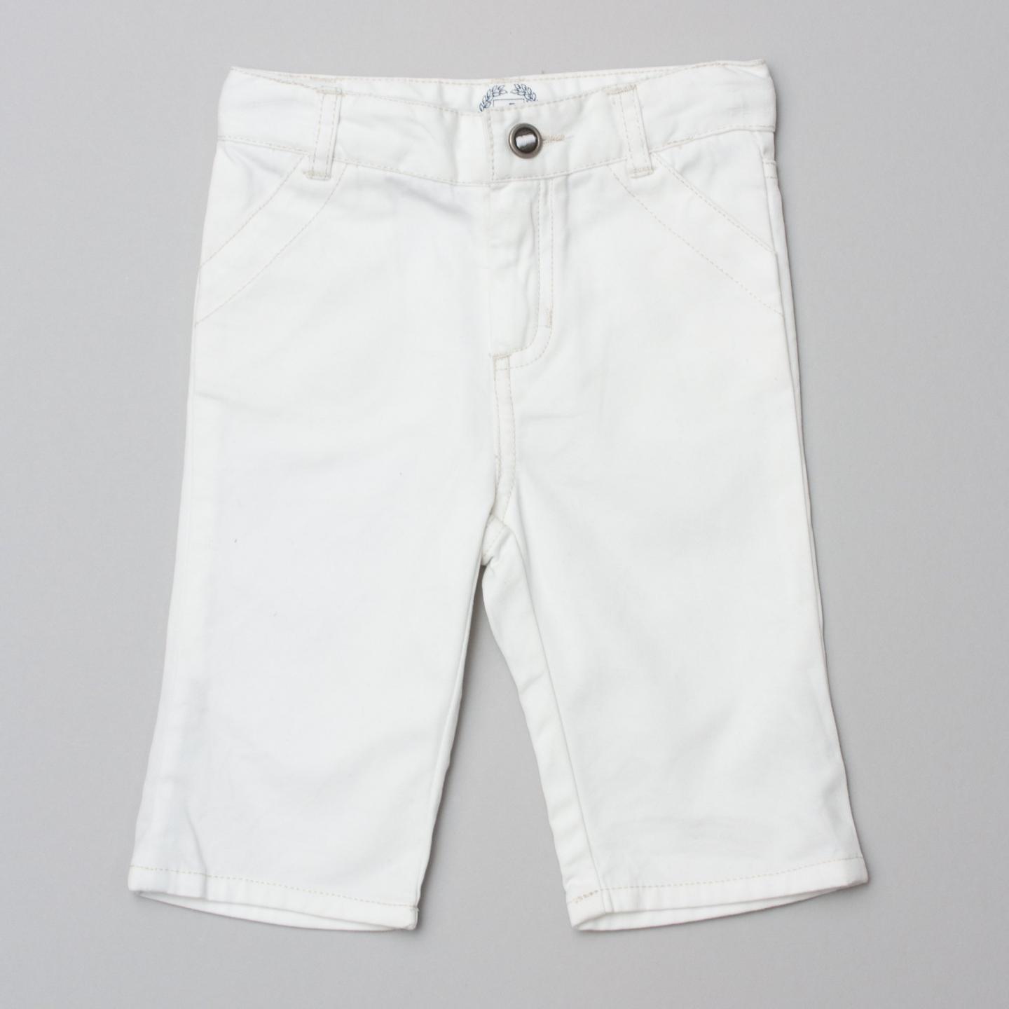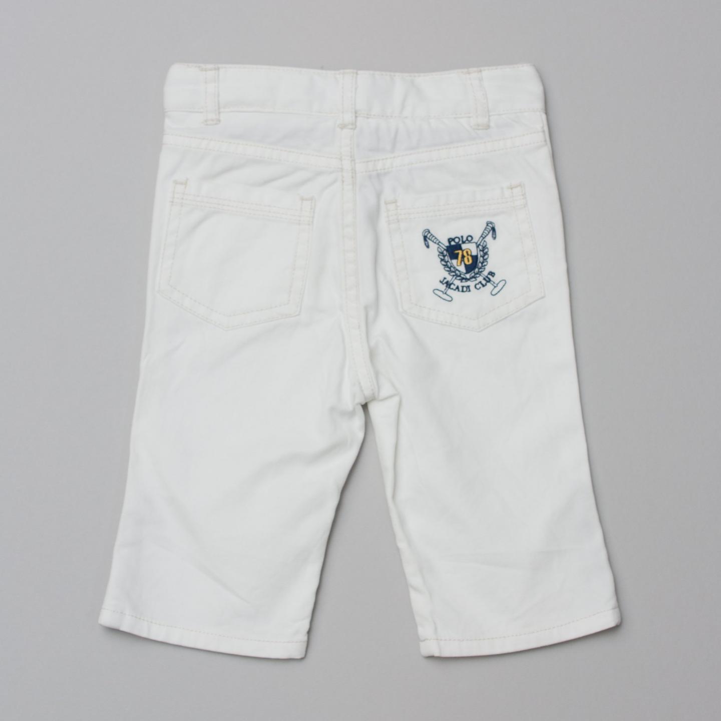 Jacadi white denim pants with front and back pockets, grey stitching detail, embroidered logo patch on back, belt loops and button/zip fastening