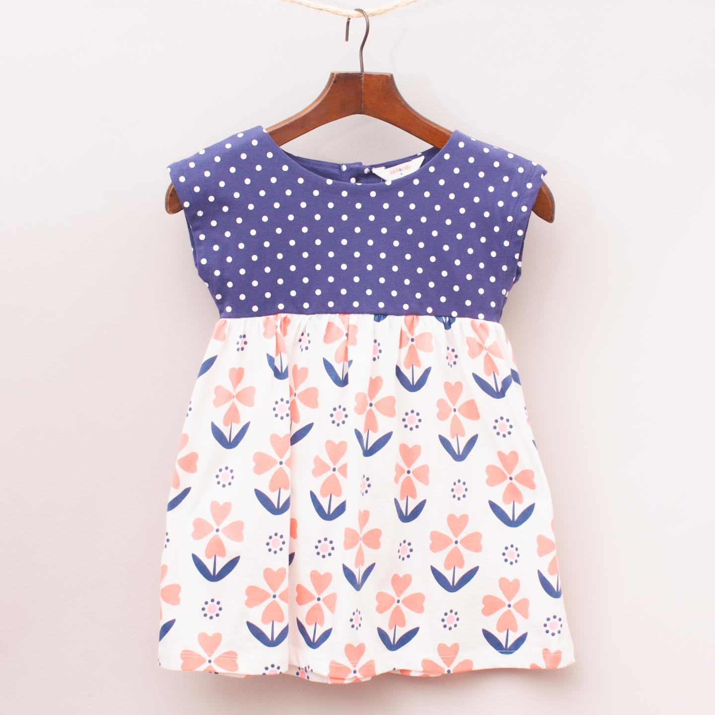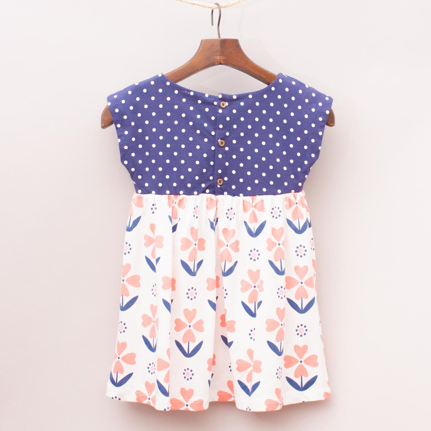 Jack & Milly blue and white polka dot dress with floral patterned skirt and full button back closure *100% Cotton