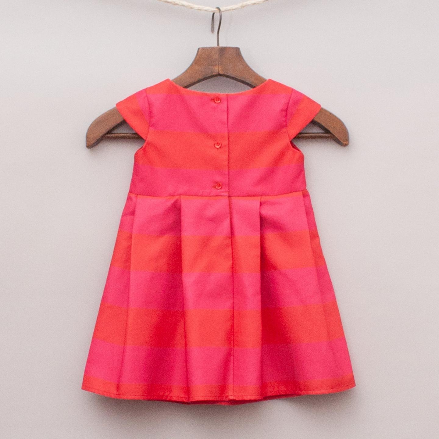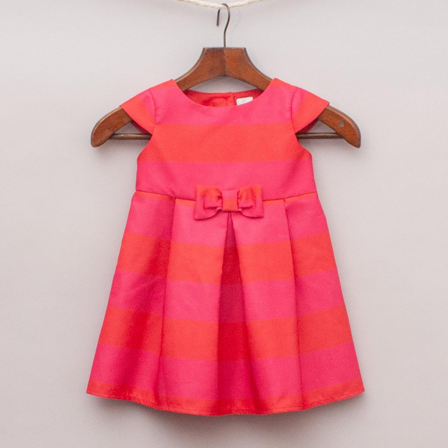 Jasper Conran bright pink and red striped dress with cap sleeves, pleated skirt, bow detail on the front and button down back closure