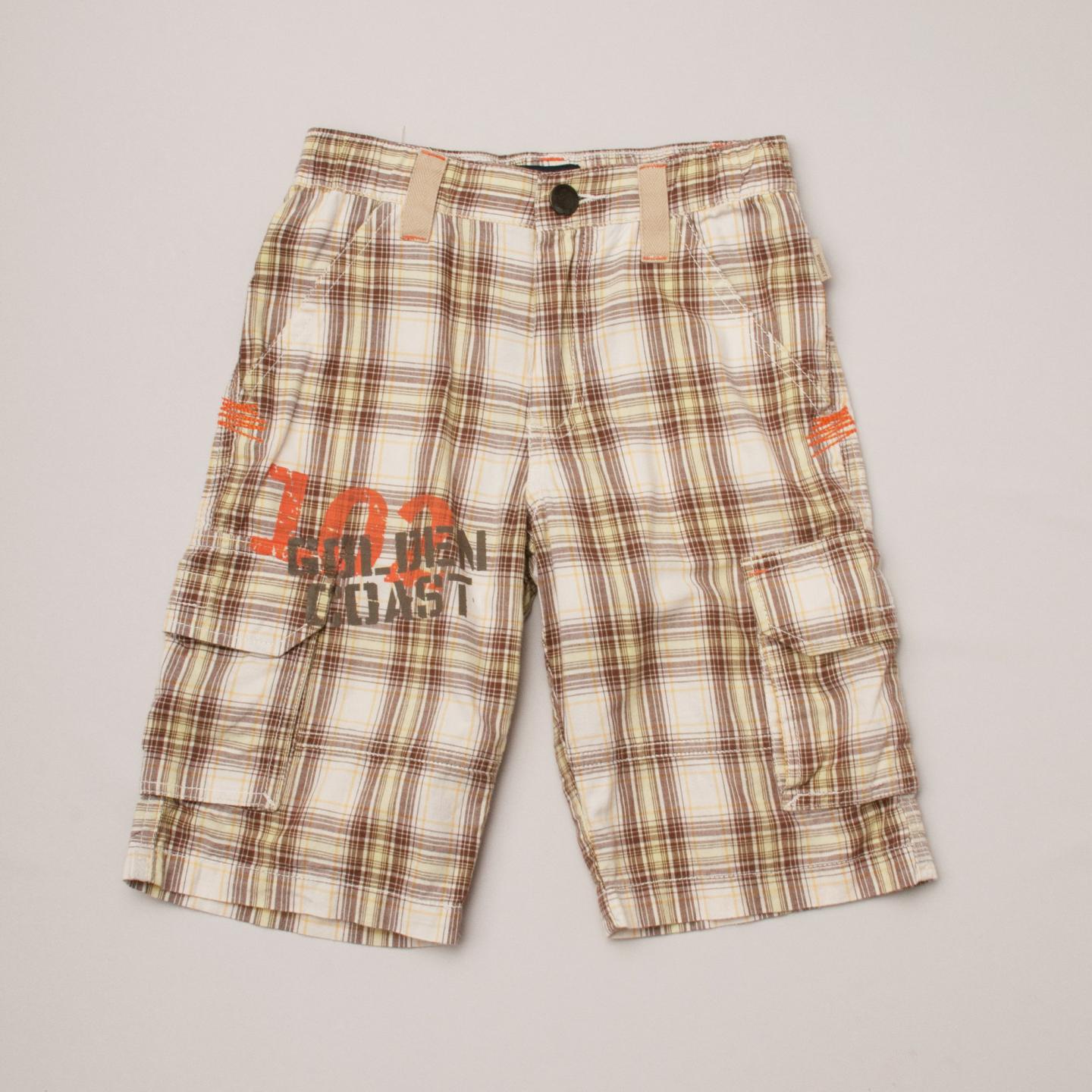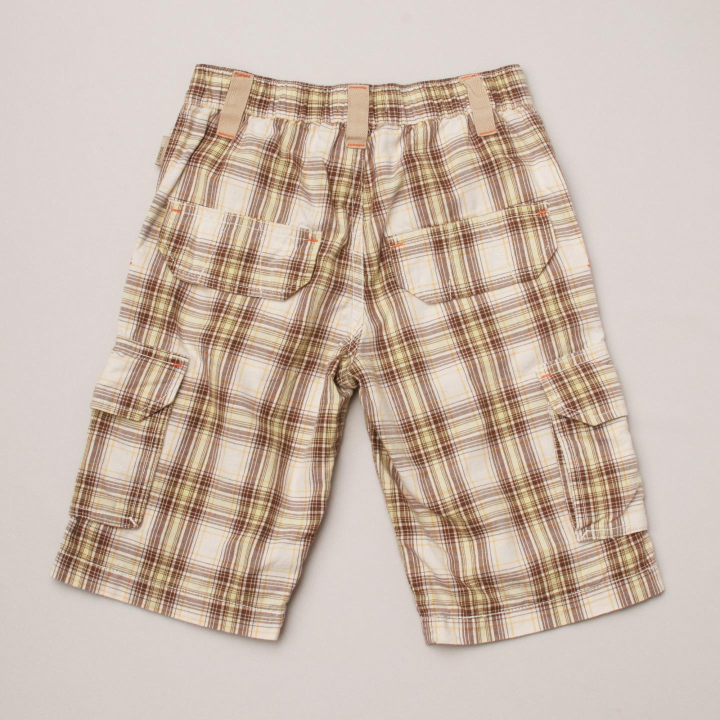 Jean Bourget plaid cargo style shorts in cream, green, mustard and brown colours with multiple pockets, belt loops and button/zip fastening