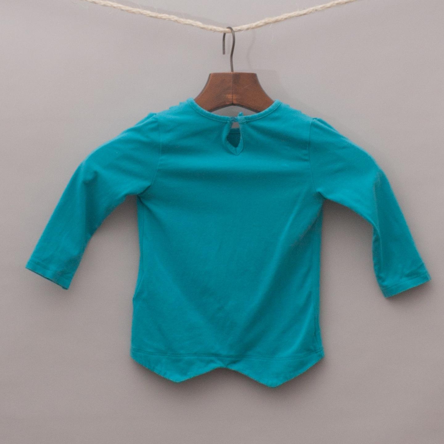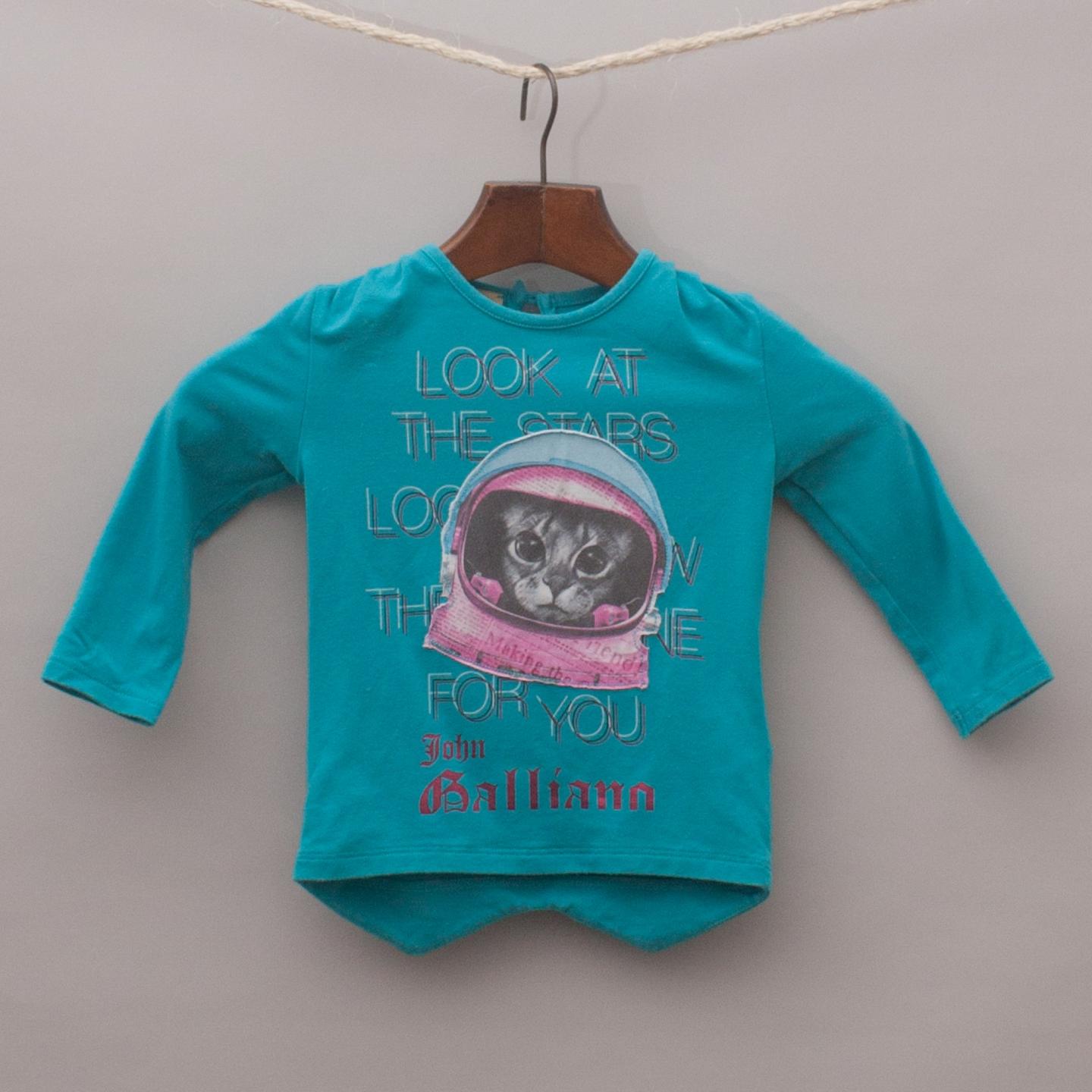 John Galliano teal blue long sleeve top with space cat image printed on the front, gathered shoulders and single button back closure
