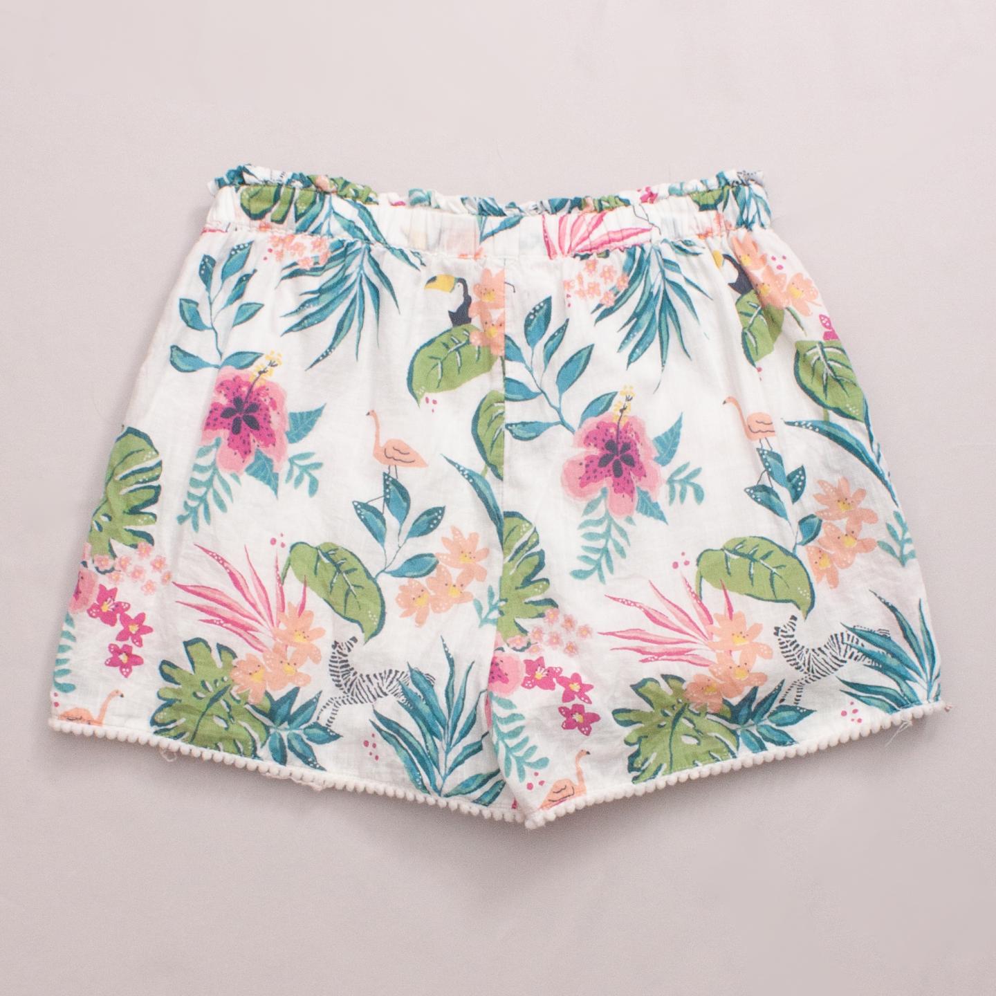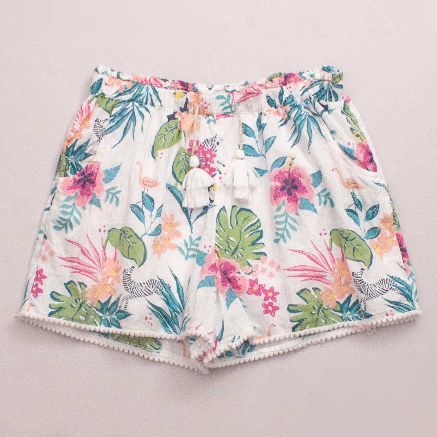 John Lewis white and floral pattern shorts with pom pom trim and elastic waistband with drawstring *100% Cotton