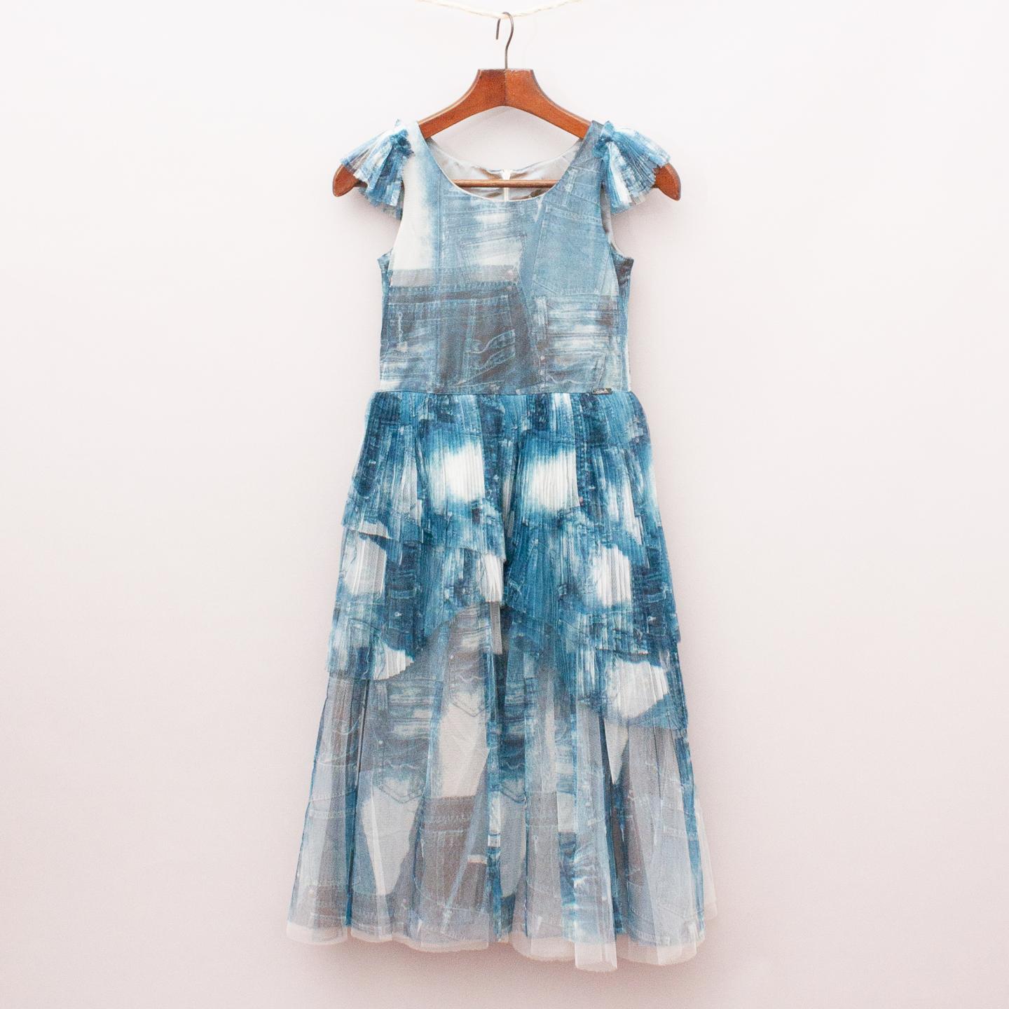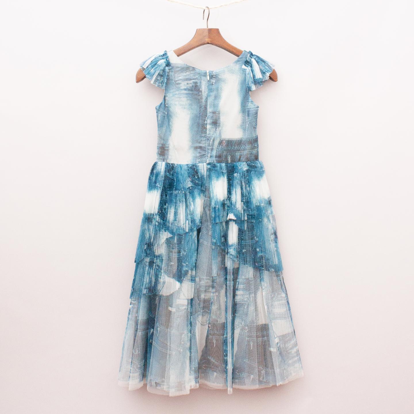 Junior Gaultier "brand new with tags" blue and white patterned dress with pleated tulle layers, sheer tulle shoulder detail, fully lined with zip back closure