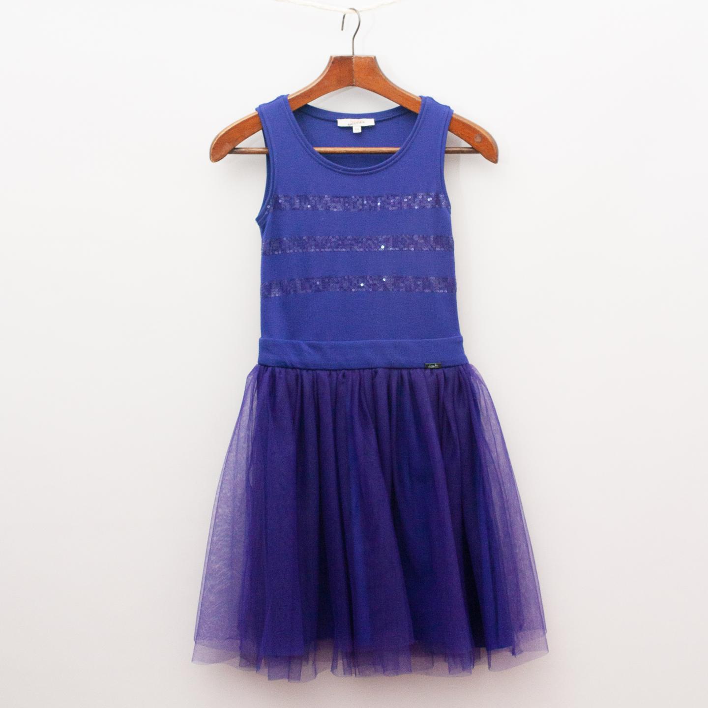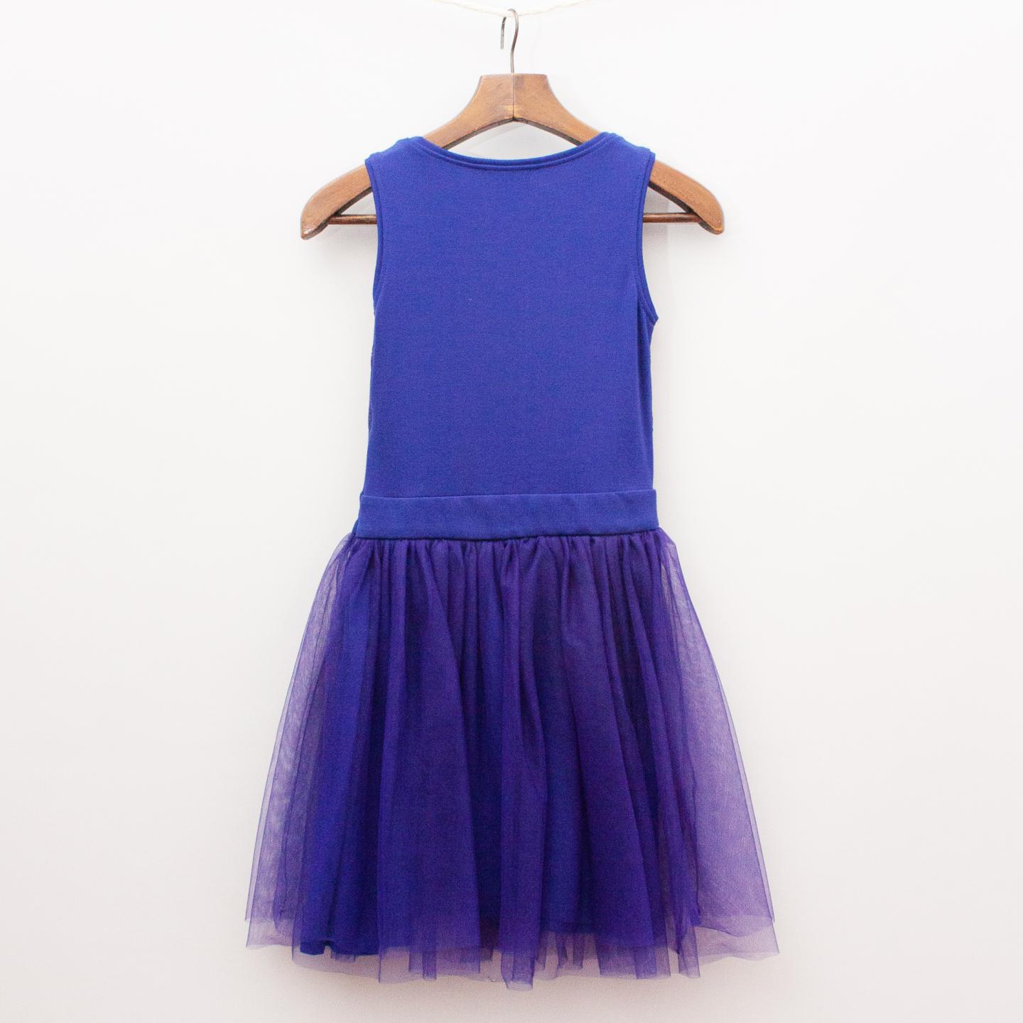 Junior Gaultier navy blue dress with stretch bodice, gathered fully lined tulle skirt, sequin stripes across the front and side zip fastening *Worn once