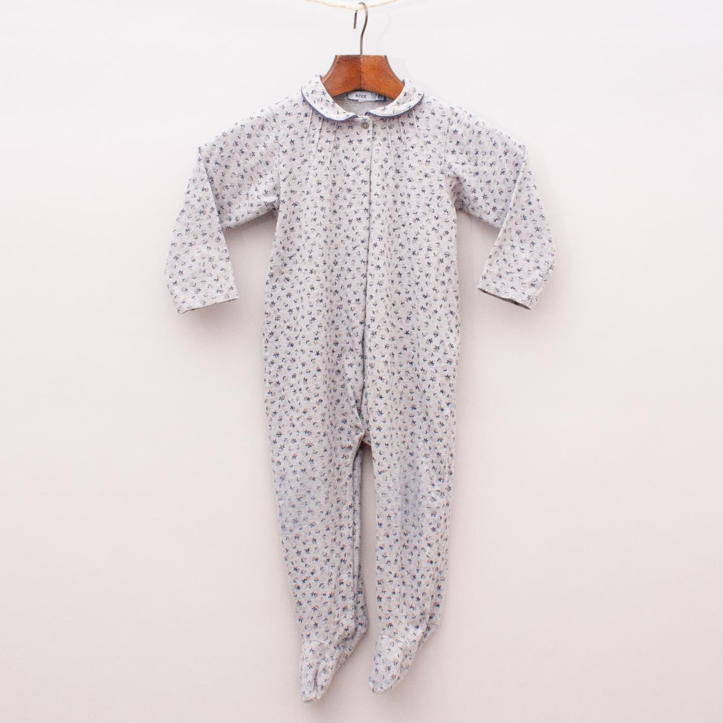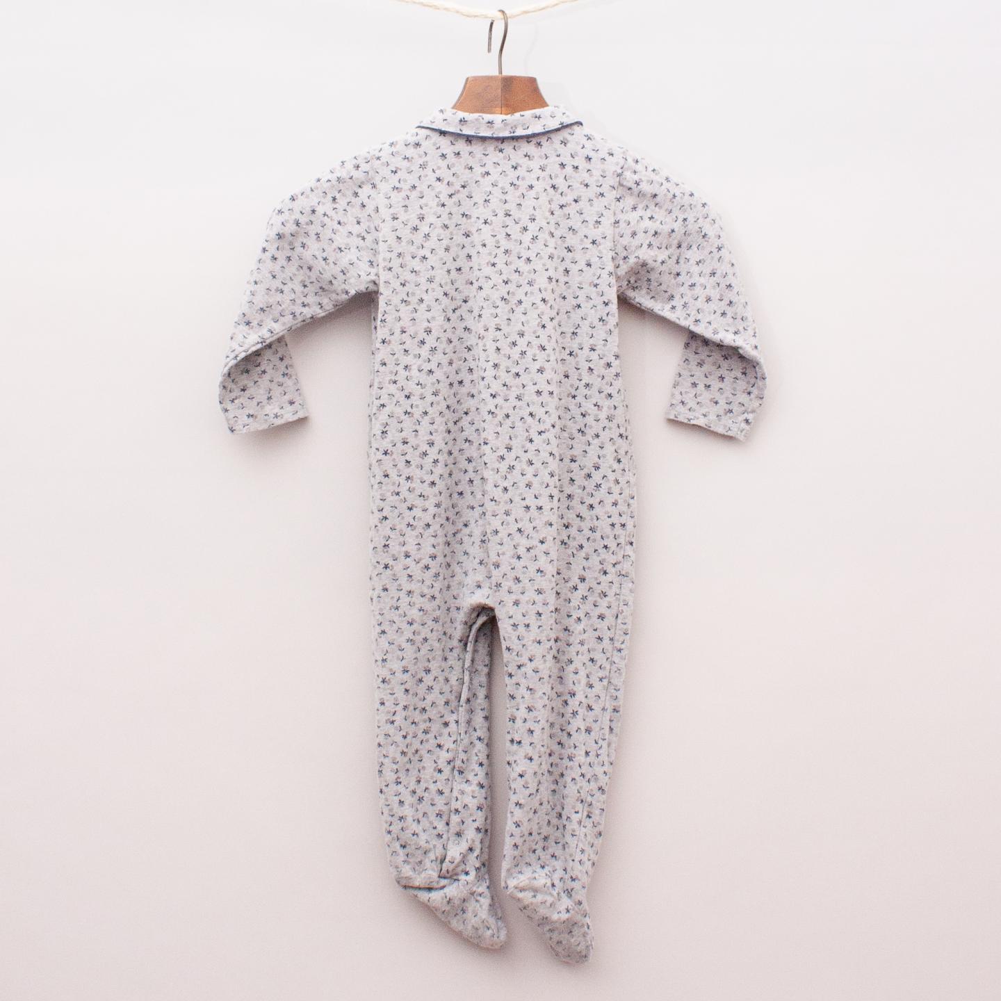 Knot grey and floral patterned long sleeve romper with pleated neckline detail, built in booties and hidden button down front