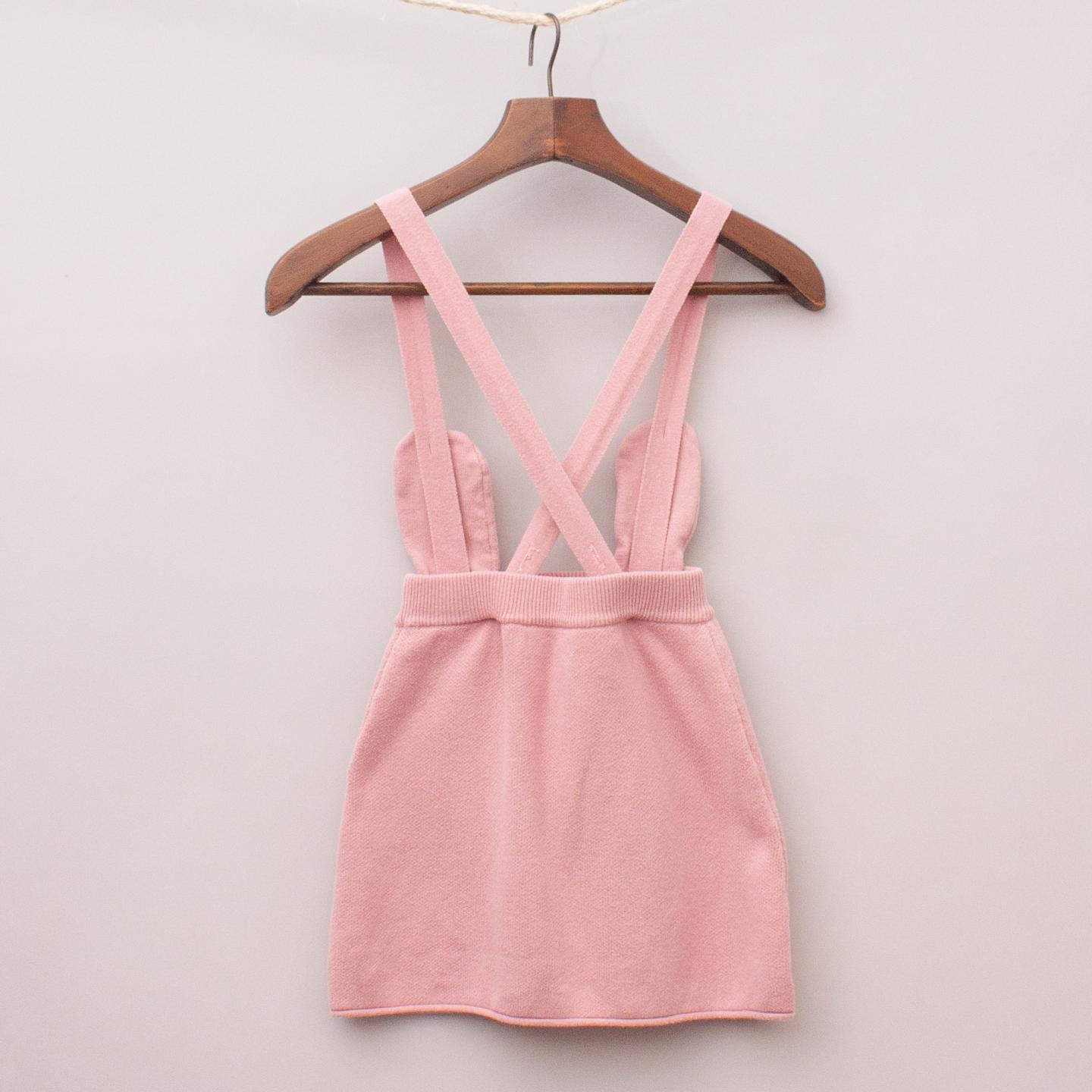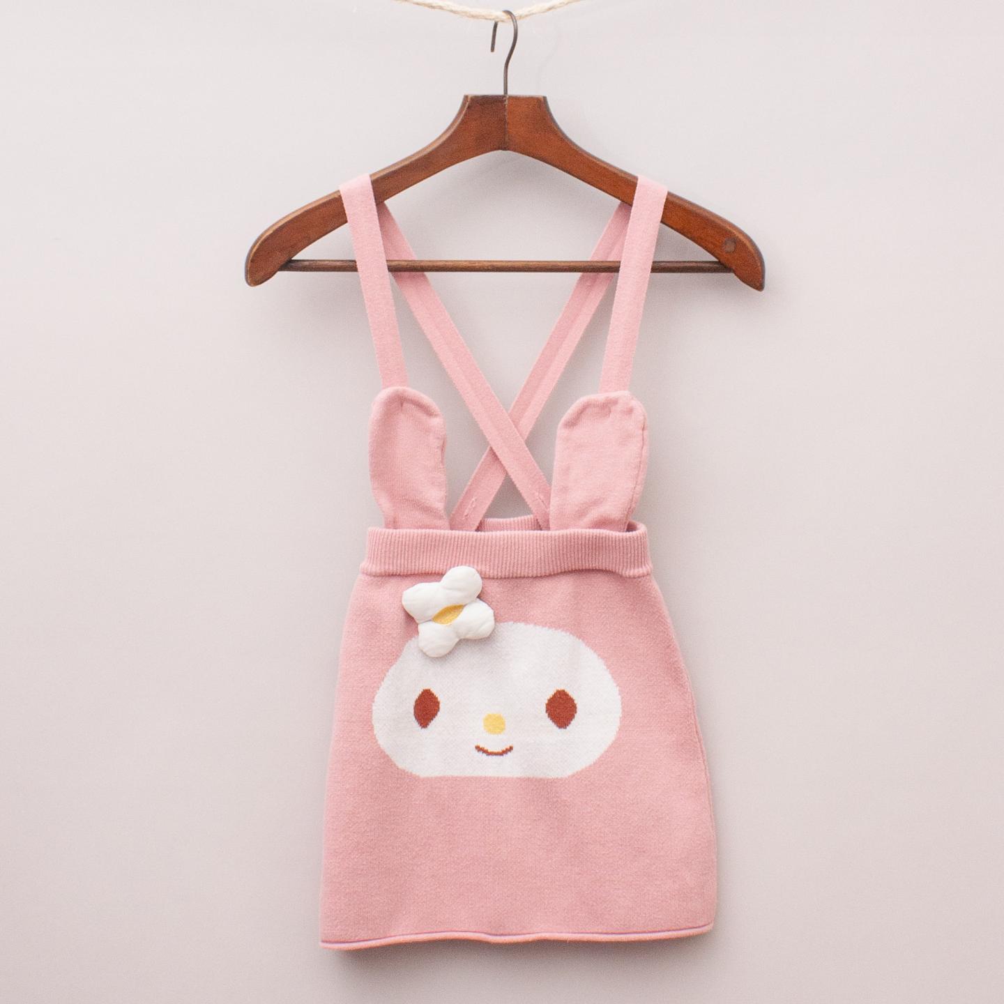 La Mitto pink woven pinafore with bunny face and ears, 3D flower on the front and cross over adjustable straps