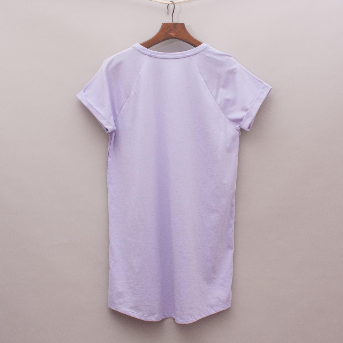 Land's End purple t-shirt with rolled edge sleeves, lace-look front, long line style and raglan sleeves