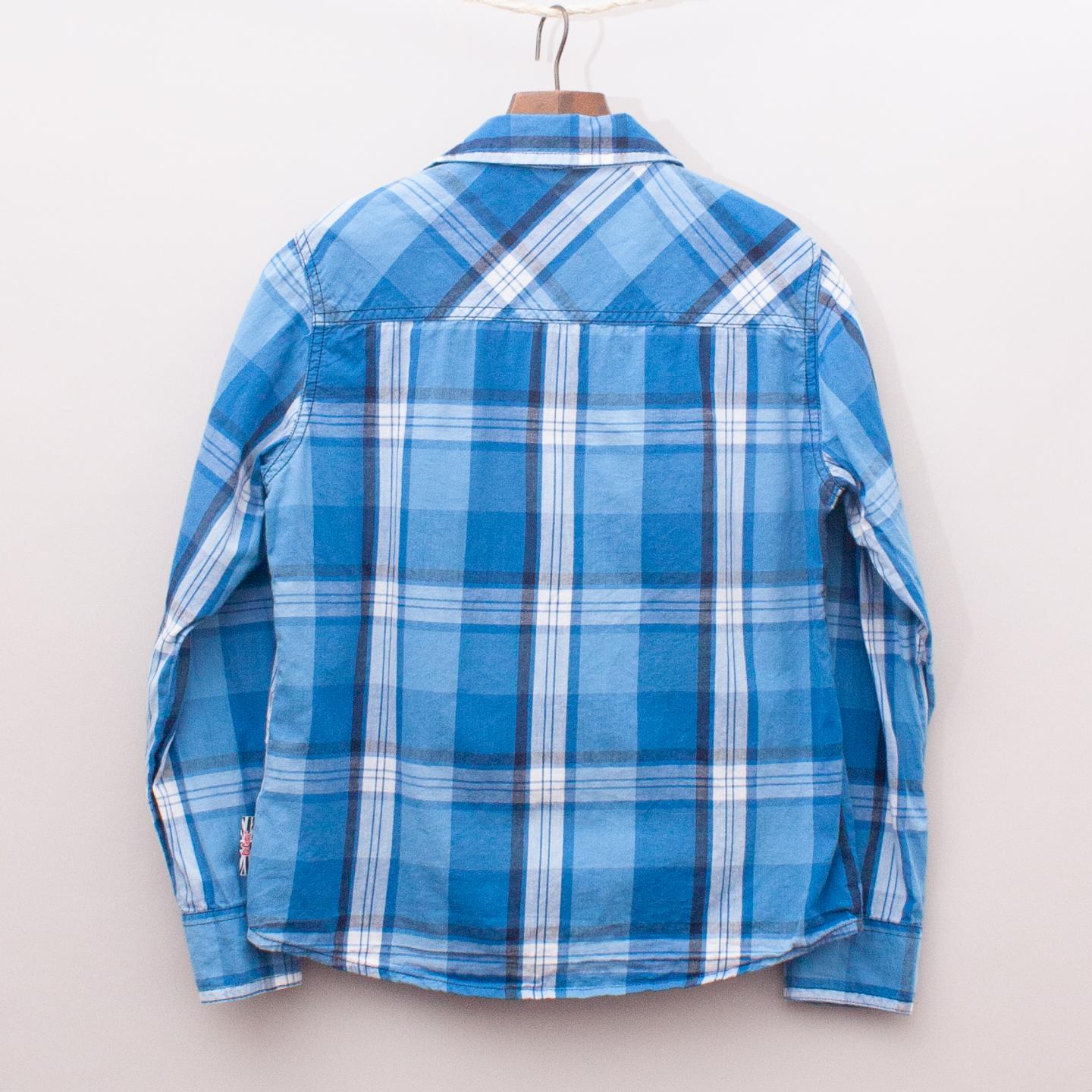 Lee Cooper blue and white plaid shirt with single front pocket, embroidered logo and full snap button down front *Marked as size 9-10