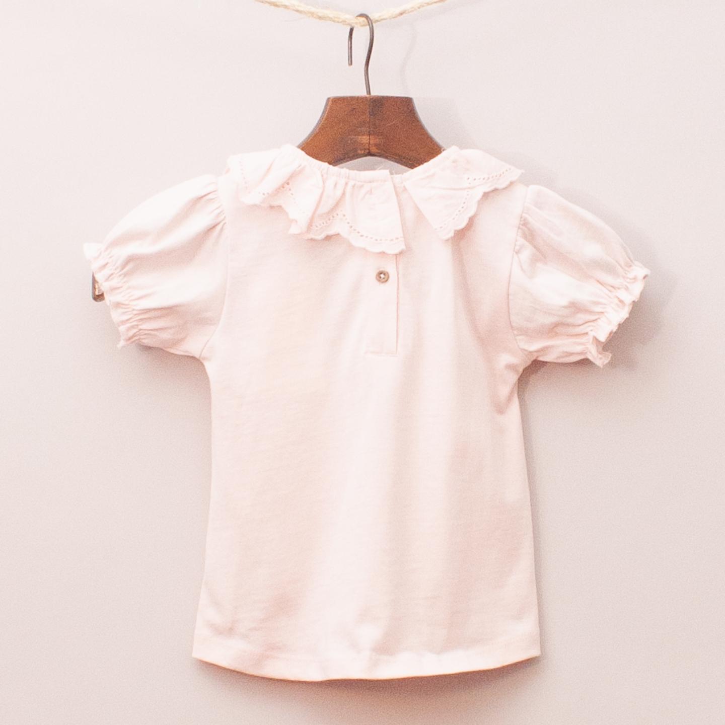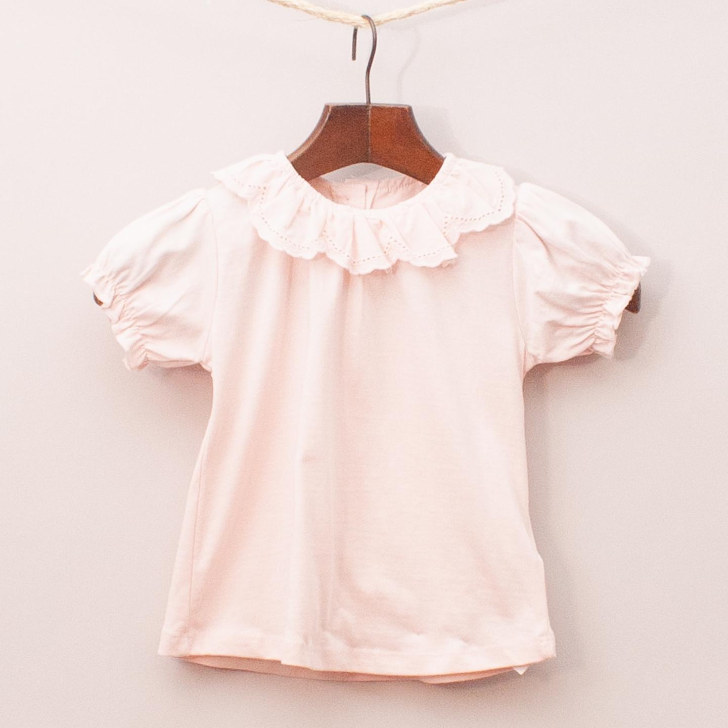 Leigh Tucker "brand new with tags" pastel top with puffed sleeves, detailed ruffle neckline and button back closure *100% Cotton