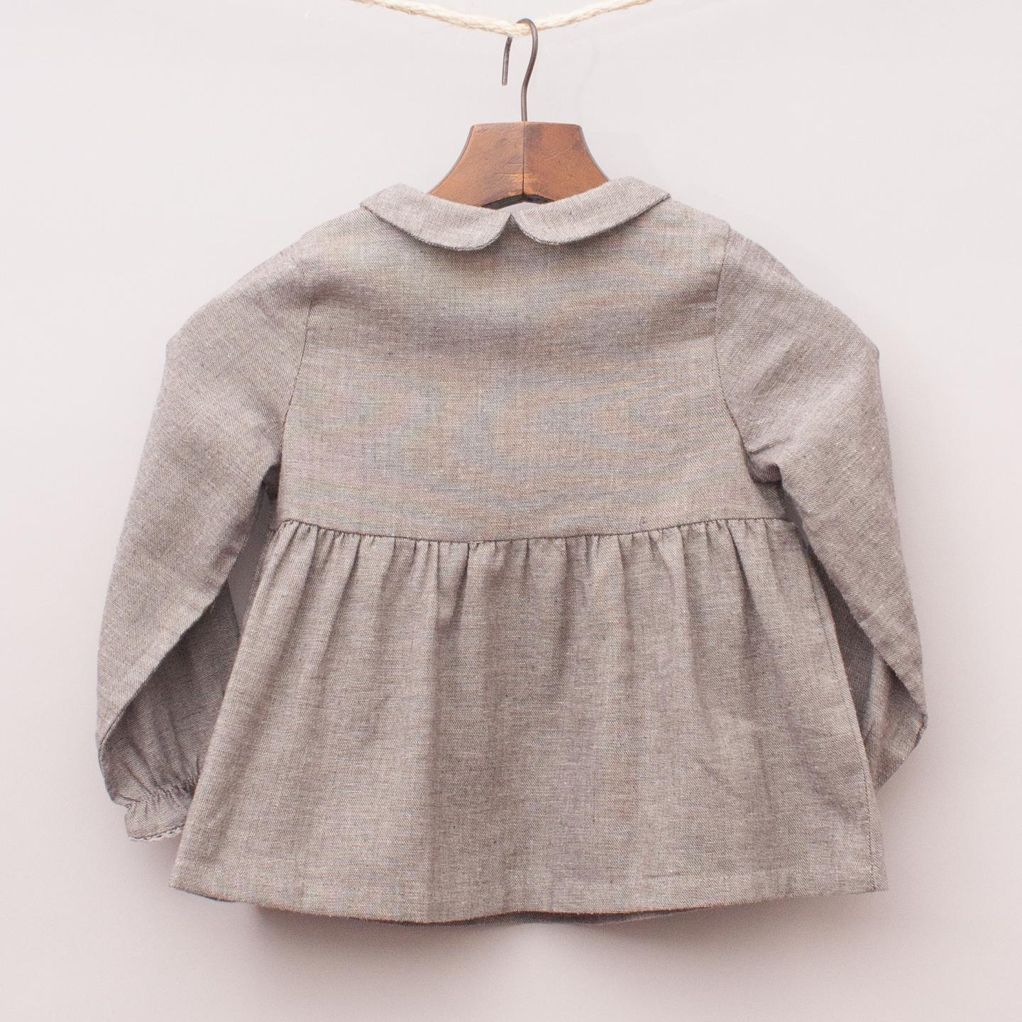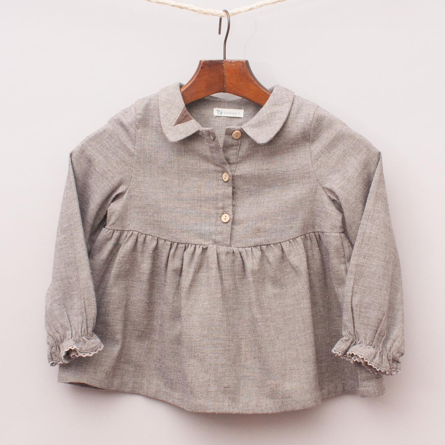 LinQian brown linen blend loose style shirt with scalloped edge elastic cuffs, button down front and gathered waistband