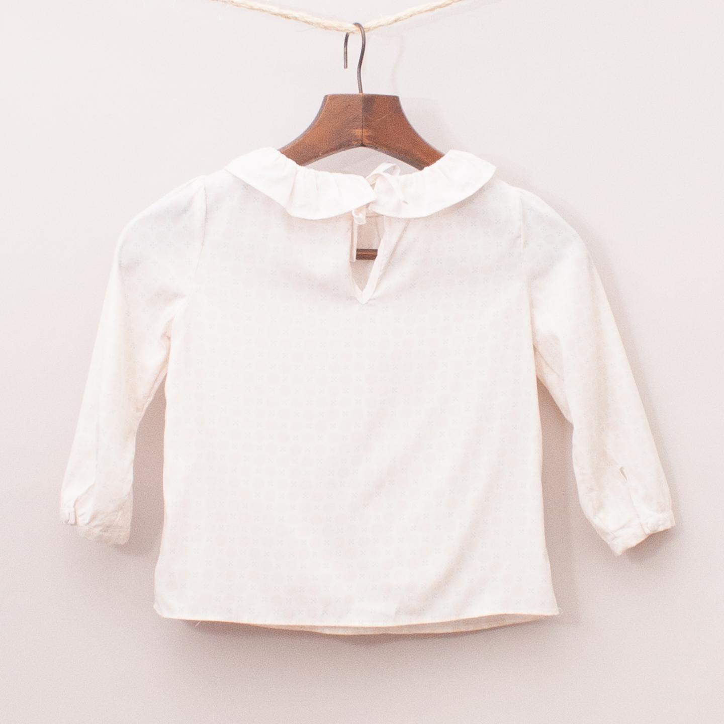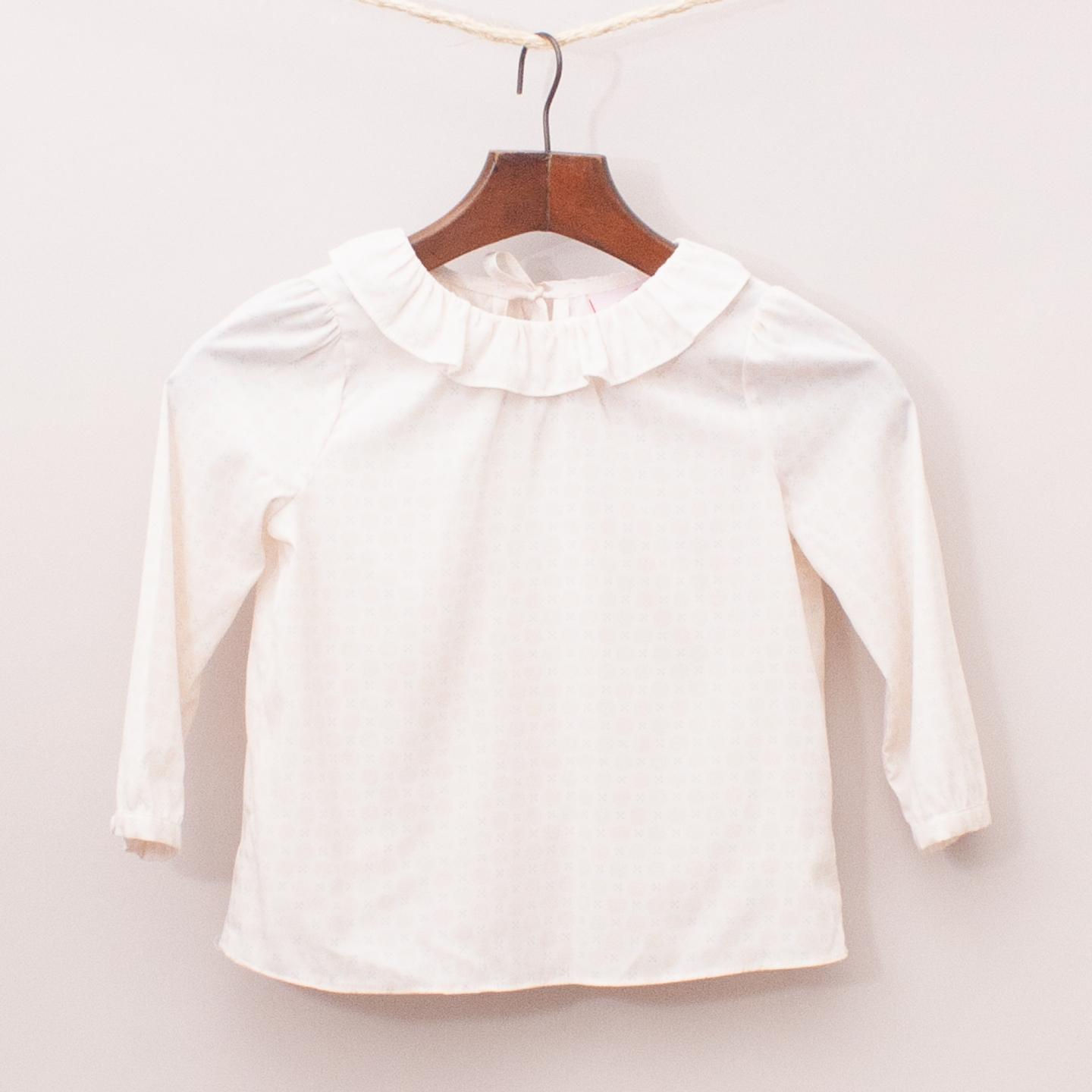 Little Leona pastel pink sheer patterned blouse with ruffle neckline and tie back closure *96% Polyester, 4% Elastane