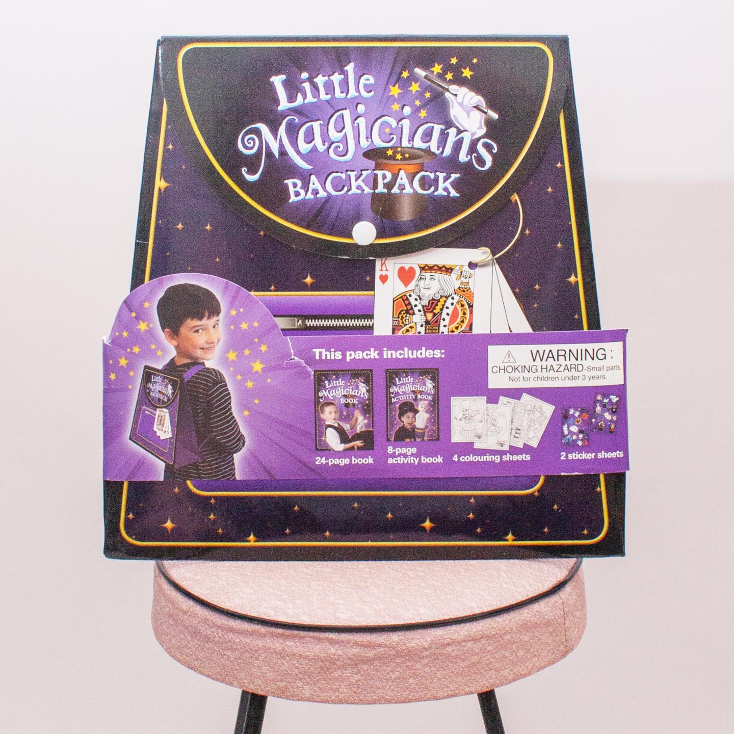 Little Magicians "brand new in packaging" backpack includes 24-page book, 8-page activity book, 4 colouring sheets and 2 sticker sheets *Small rip in packaging but the backpack itself is fine