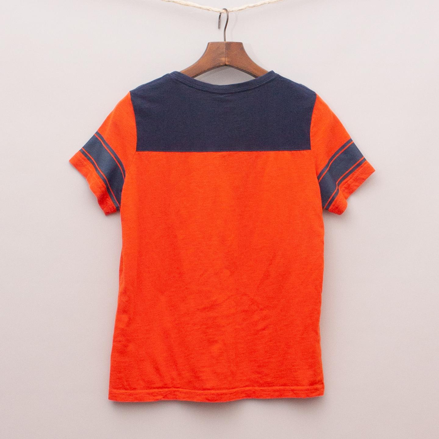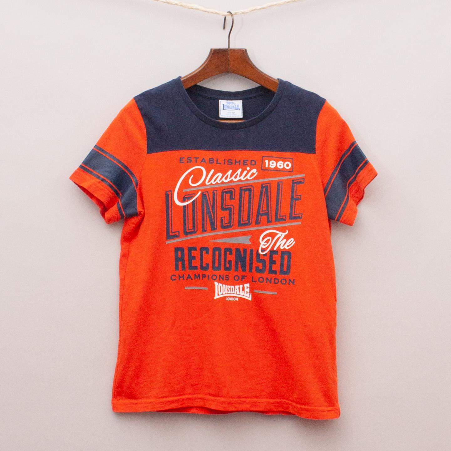 Lonsdale red and navy blue t-shirt with printed logo throughout and striped sleeves