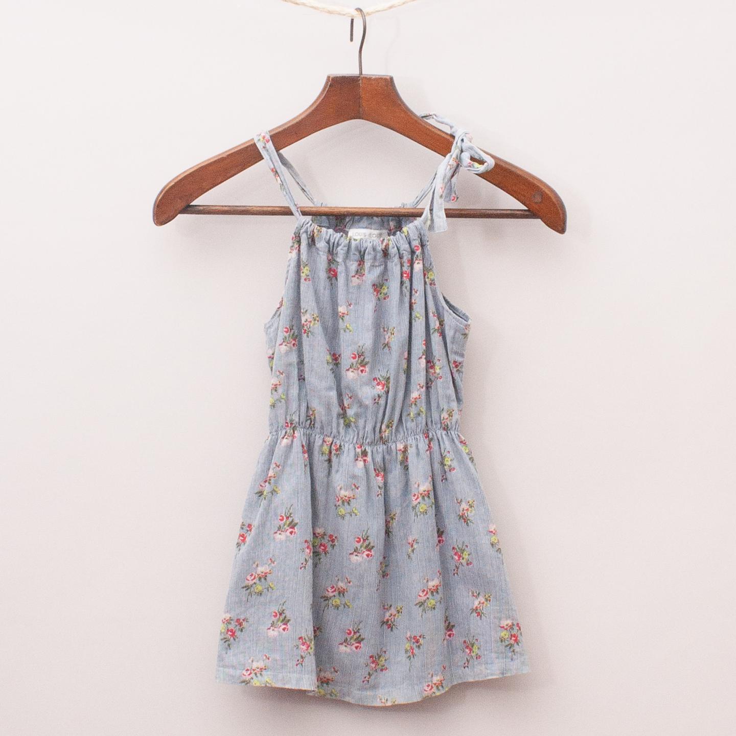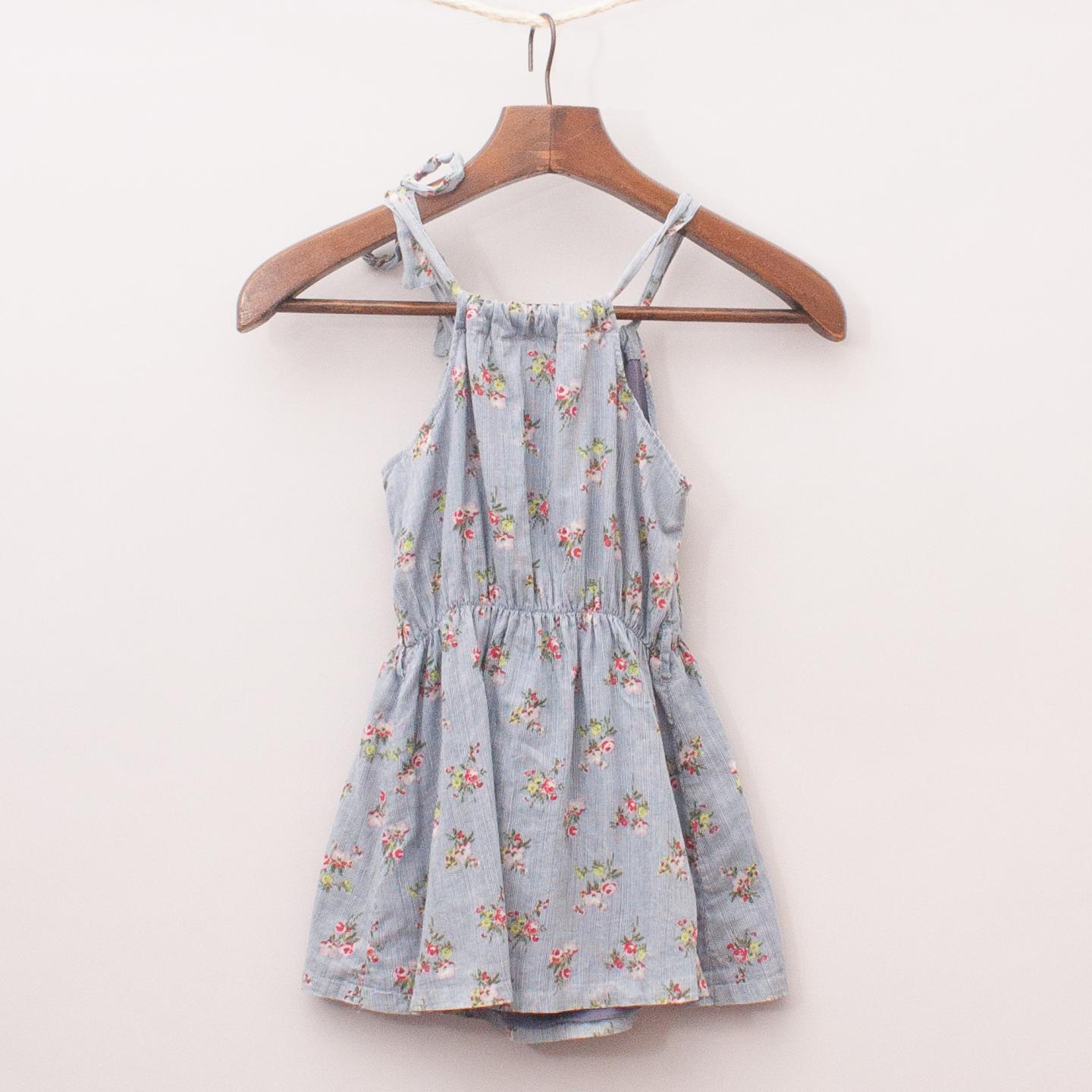 Louis Louise blue and floral patterned playsuit with elastic waistband, gathered neckline and tie strap *100% Cotton
