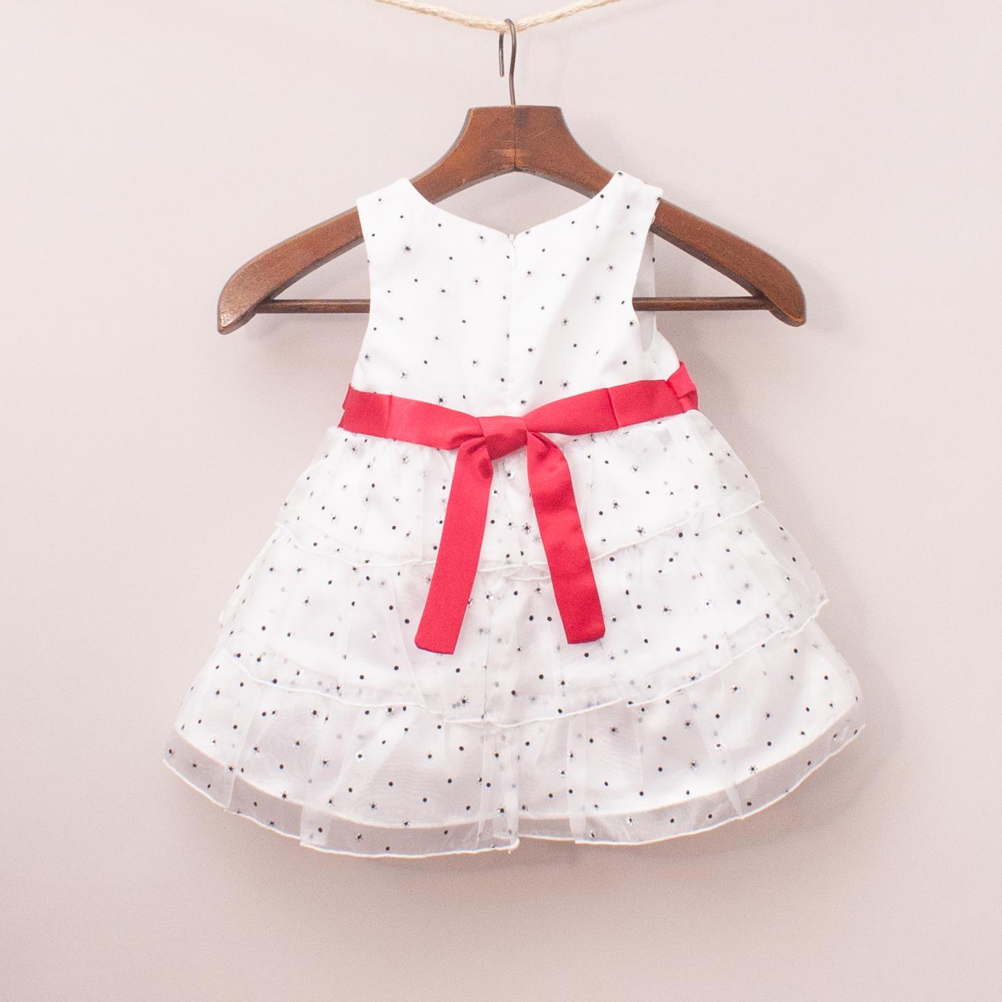 Love white satin and sheer ruffle skirt with black polka dots, glitter details and red satin flower belt *100% Polyester