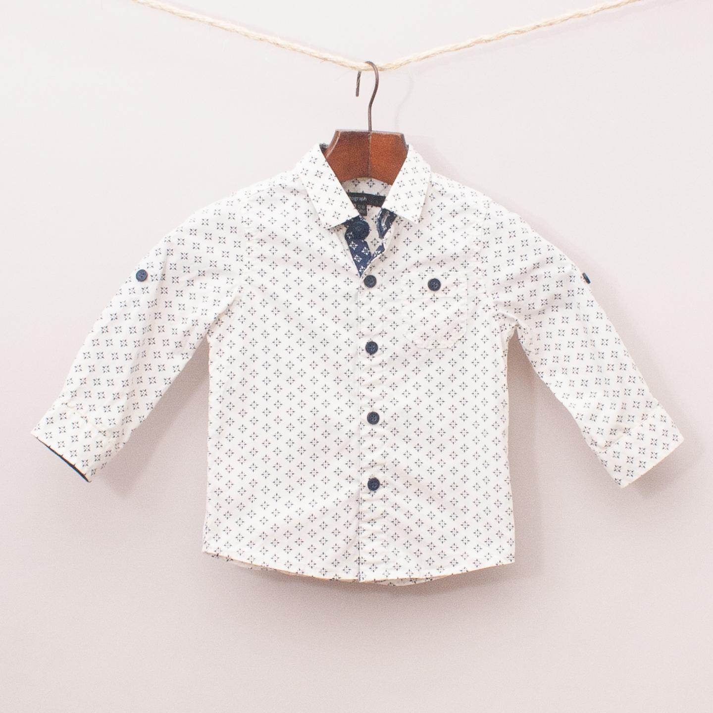 M&S white and navy blue patterned shirt with single front pocket and full button down front *100% Cotton