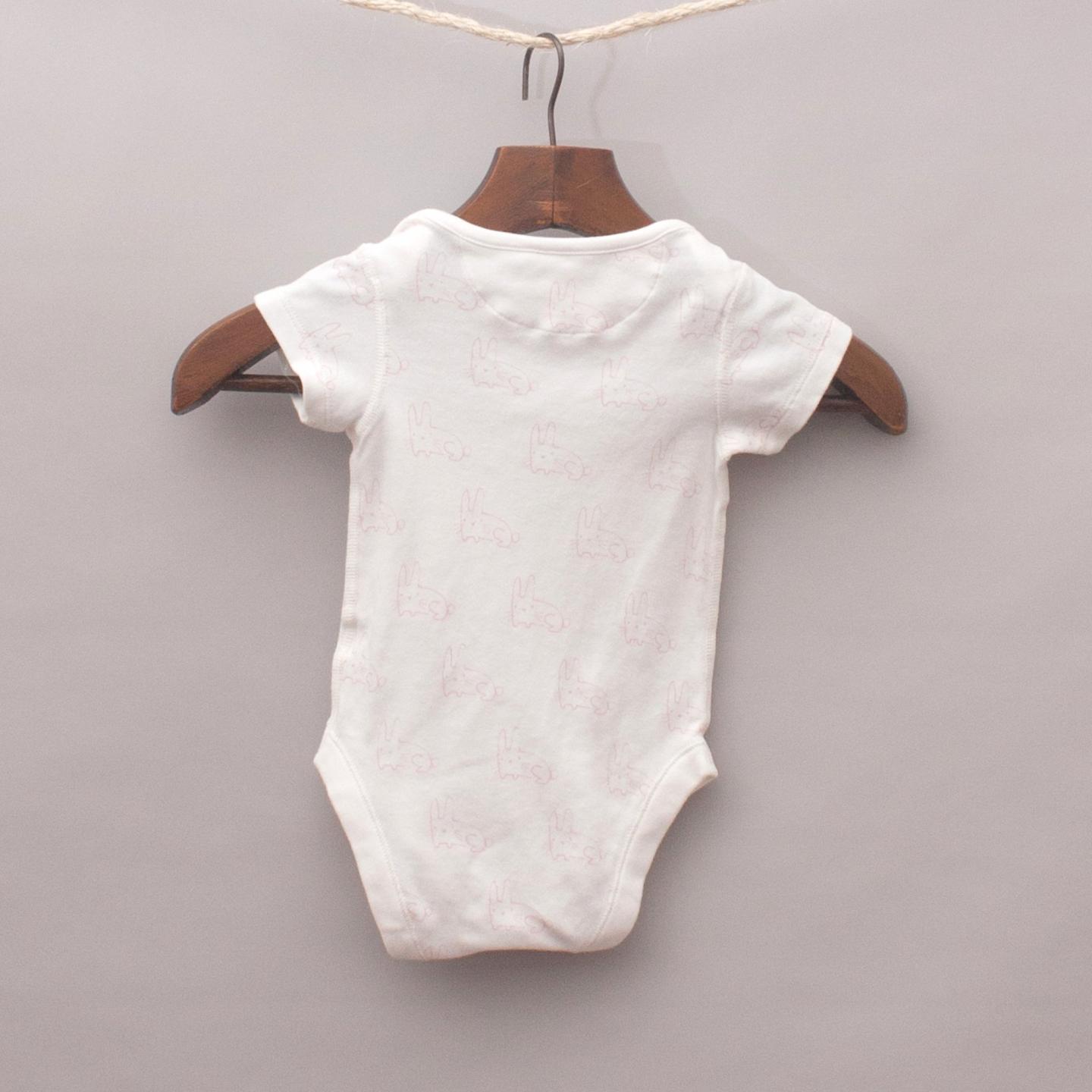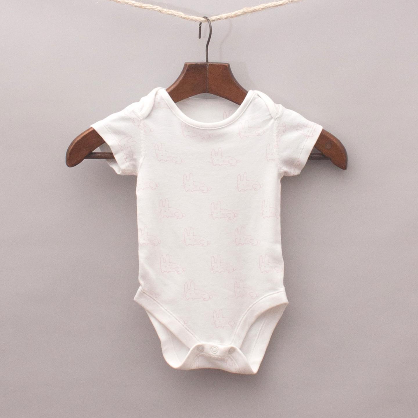 M&S cream short sleeve romper with pastel pink rabbit print throughout and button up closure