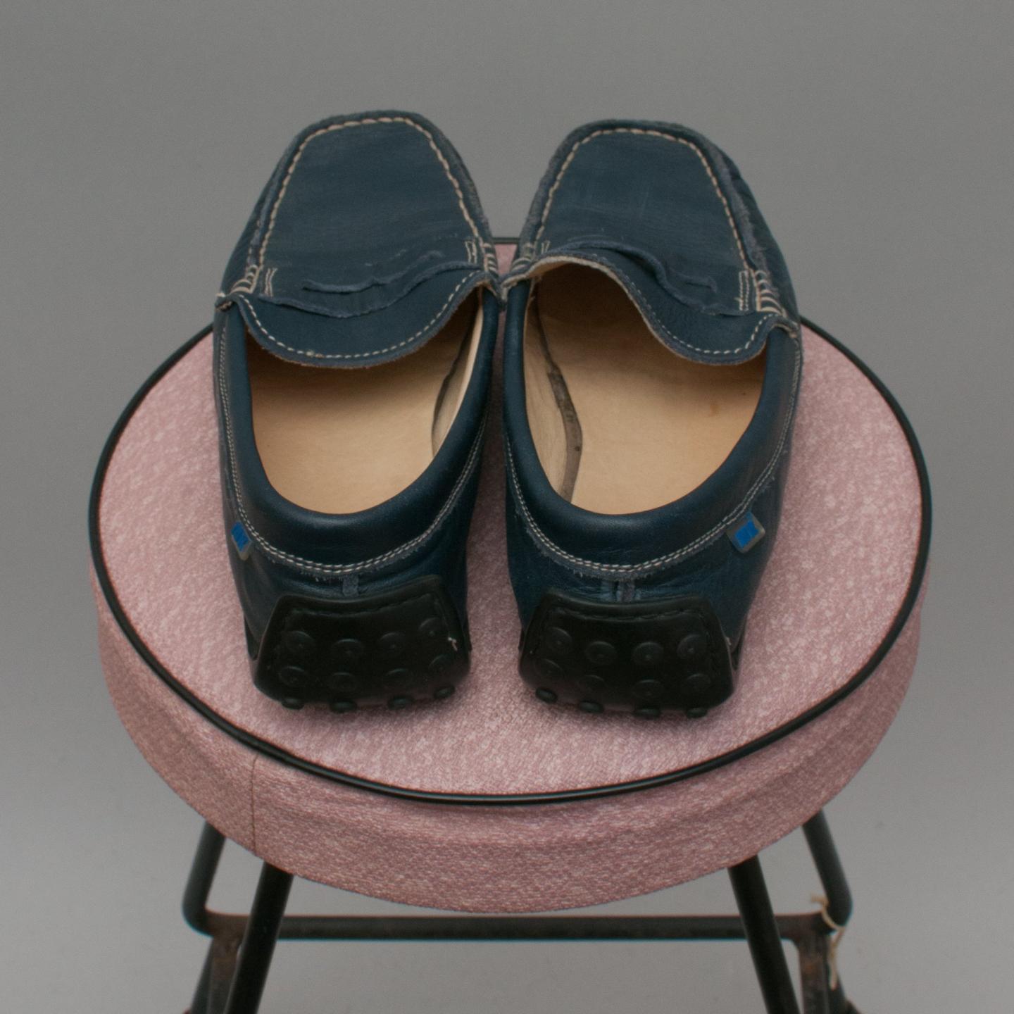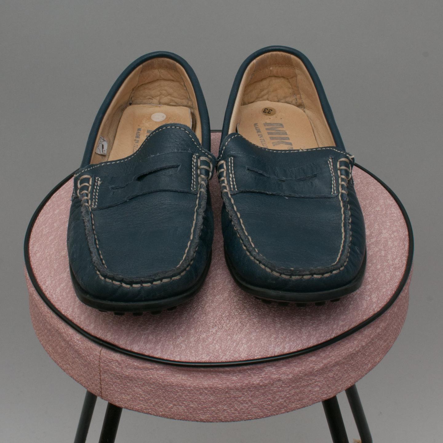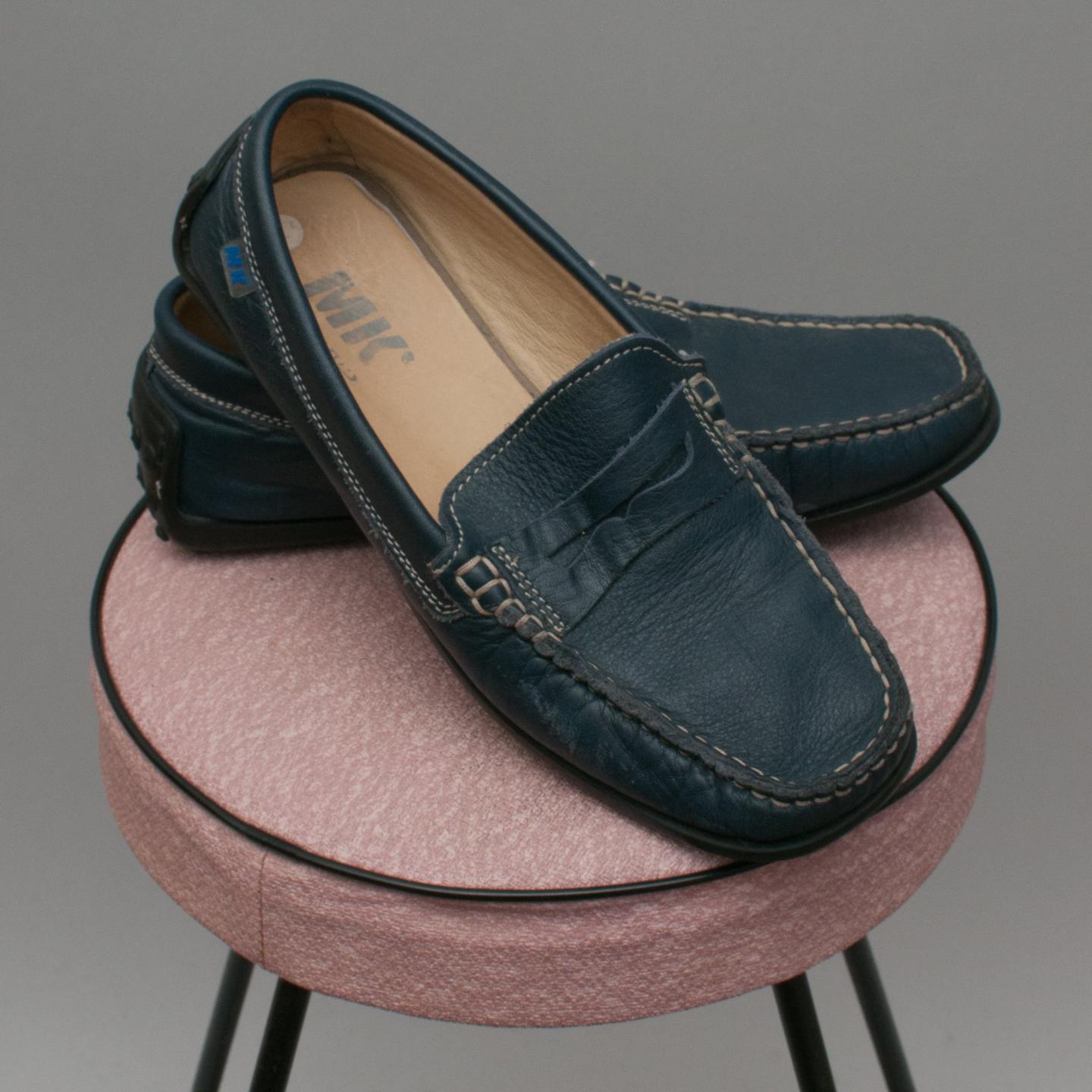 MK navy blue leather sip on shoes with beige stitching detail and sturdy rubber soles (Age 6 Approx.)