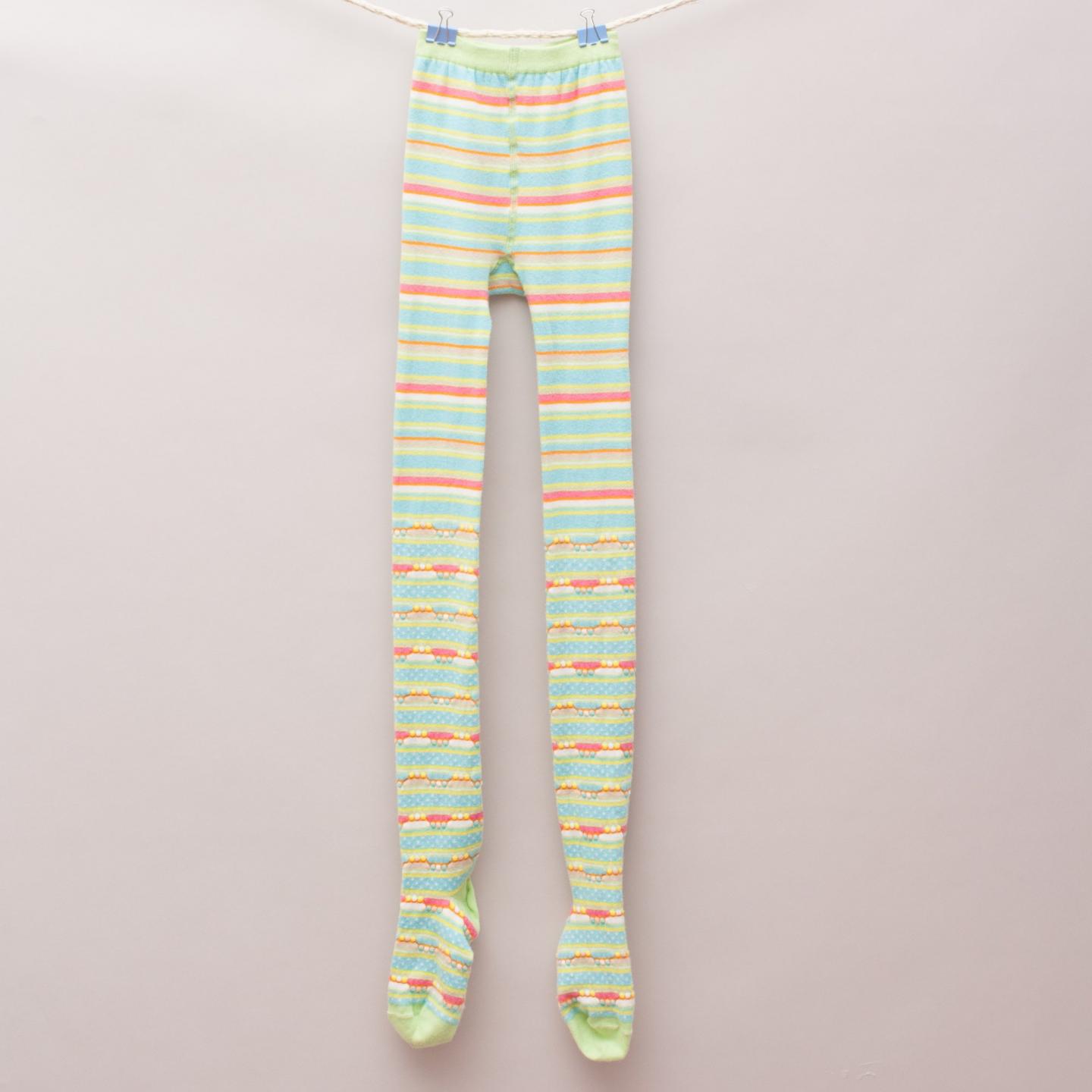 MP bright blue, green, pink and white striped tights with textured spot detail and polka dots around the calf and foot