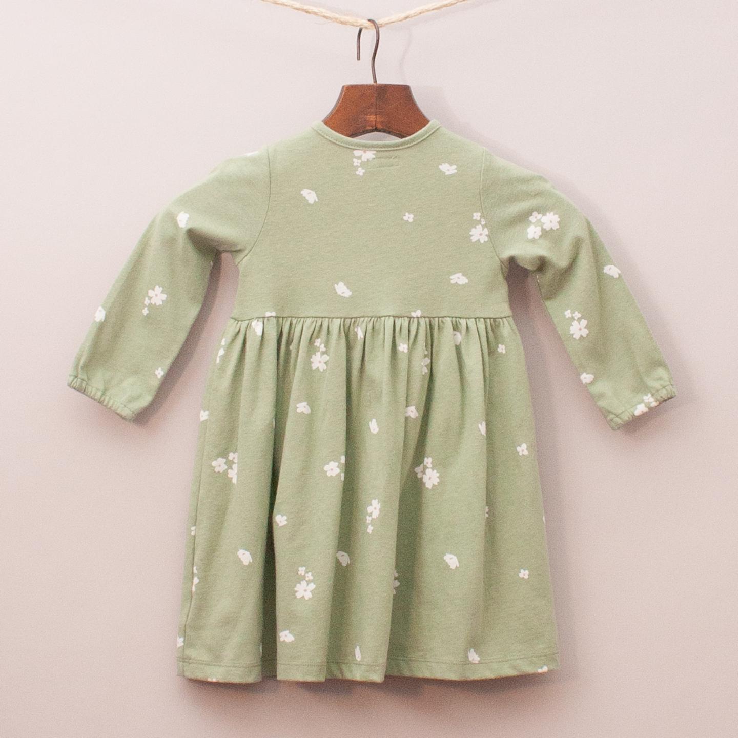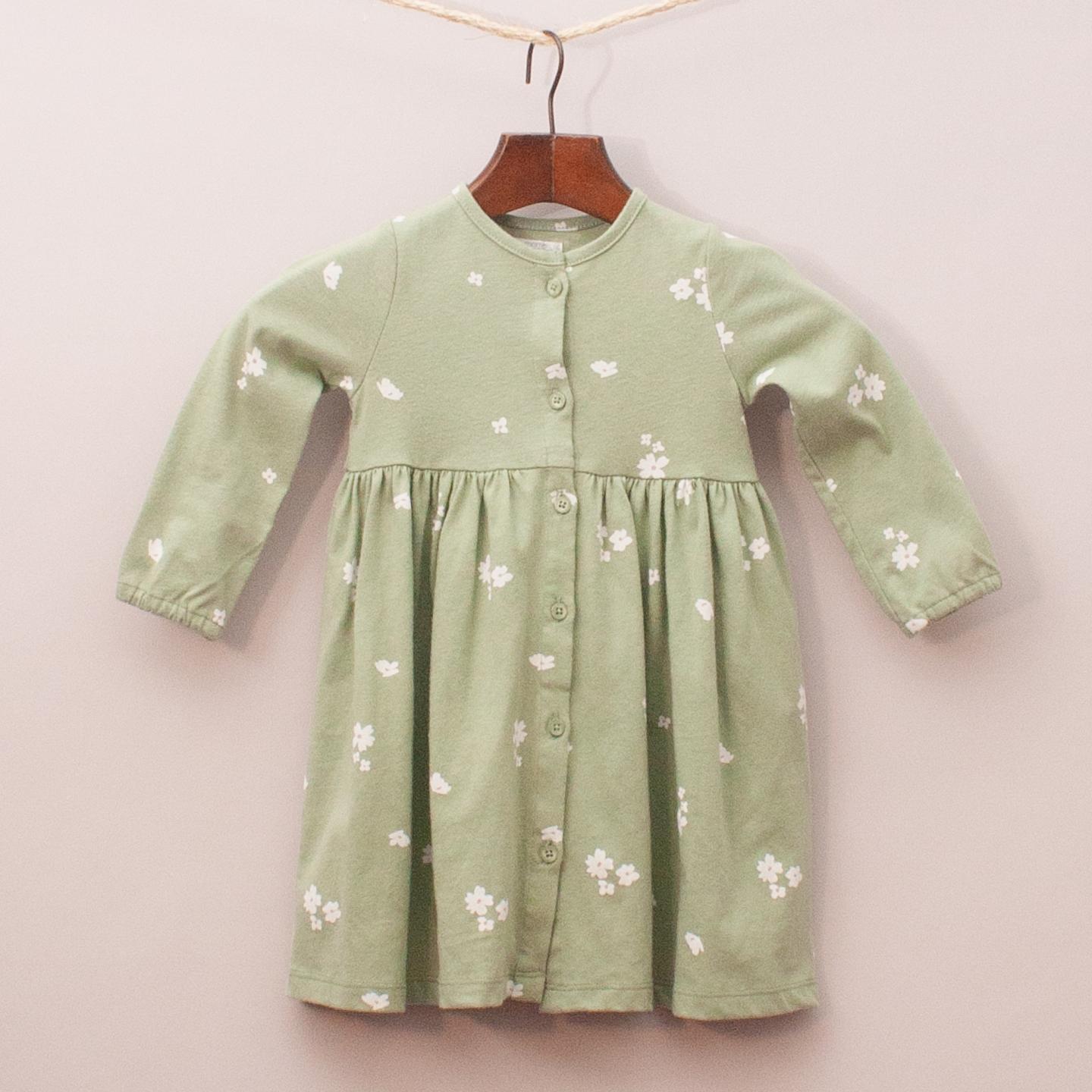 Mamas & Papas green and floral patterned dress with gathered skirt and full button down front *100% Cotton