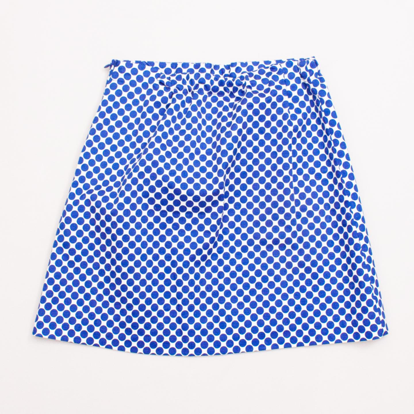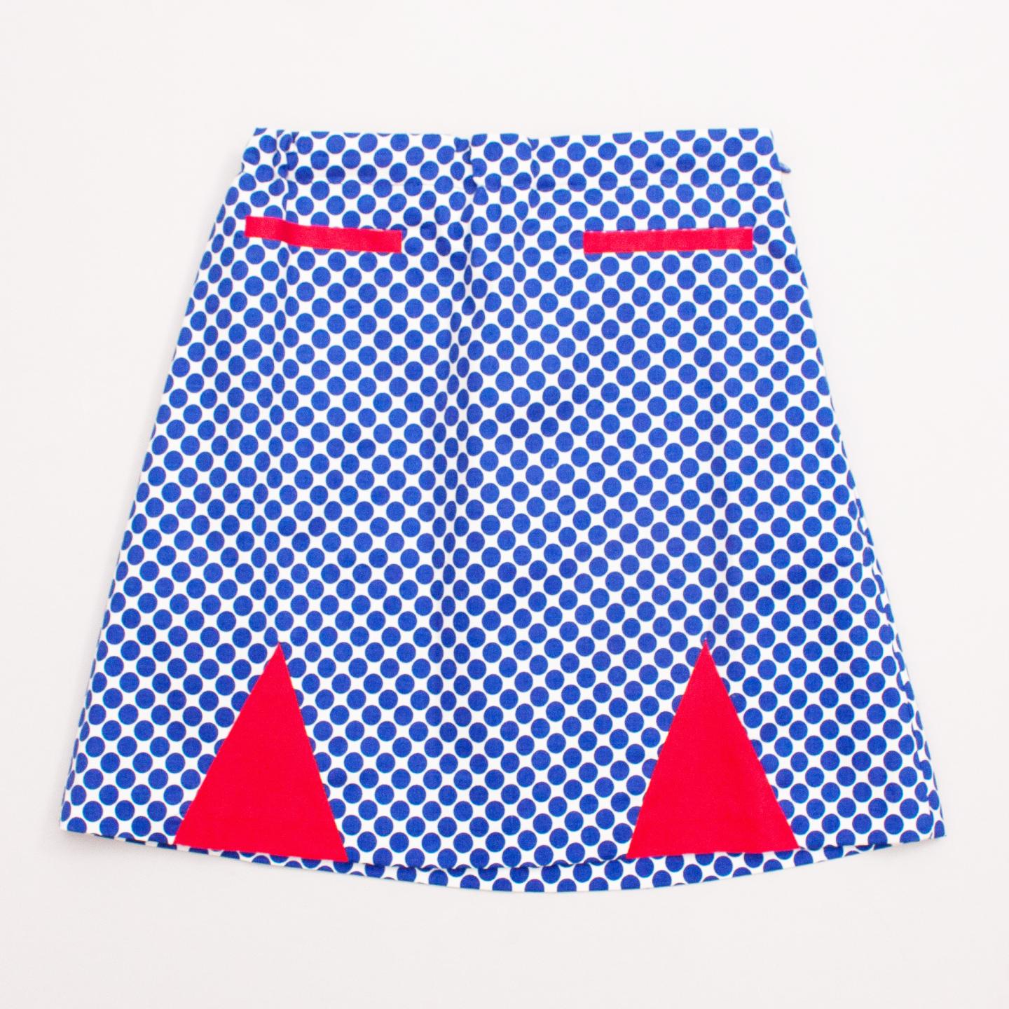 Marc & Molly's "brand new with tags" bright blue and white spotted skirt with red accents throughout, elastic waistband and side zip fastening