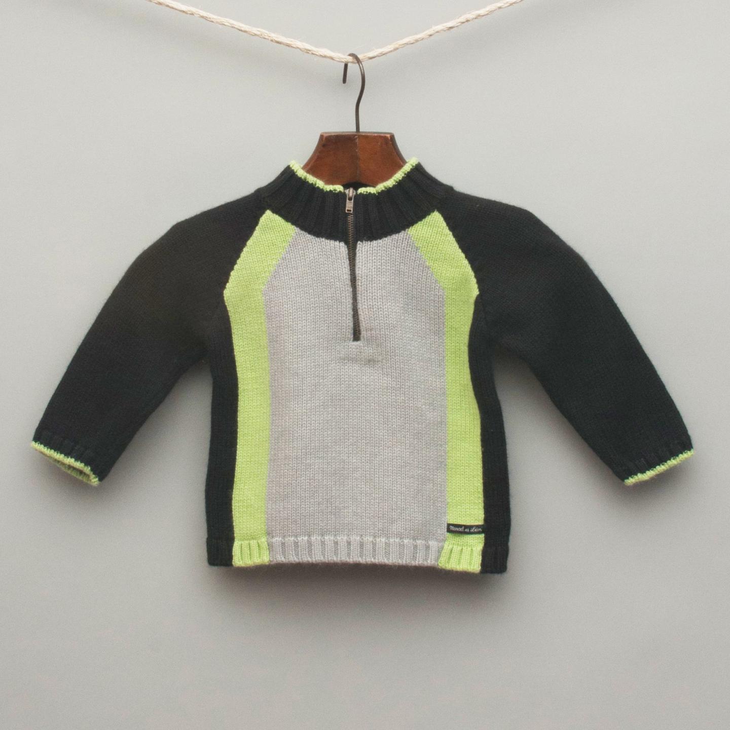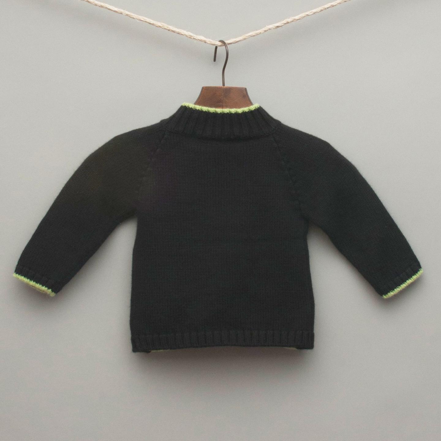 Marcel et Leon navy blue knitted jumper with grey and green front and green trimmed cuff