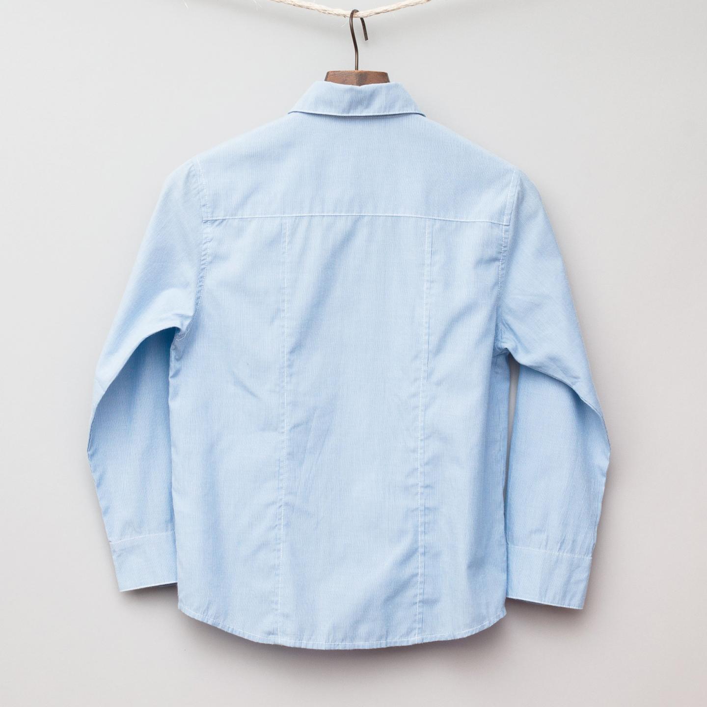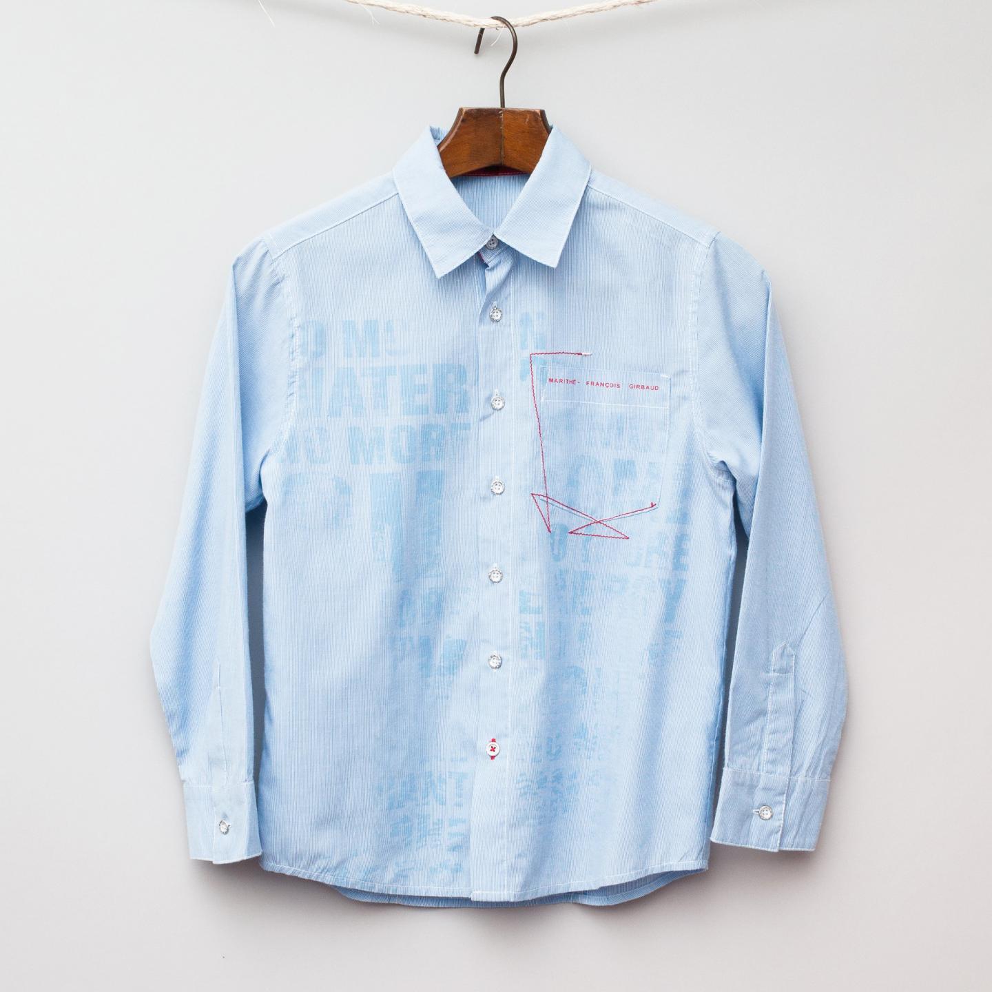 Marithe + Francois Girbaud light blue pin stripe shirt with blue printed lettering on front, red stitiching detail and metal edged buttons