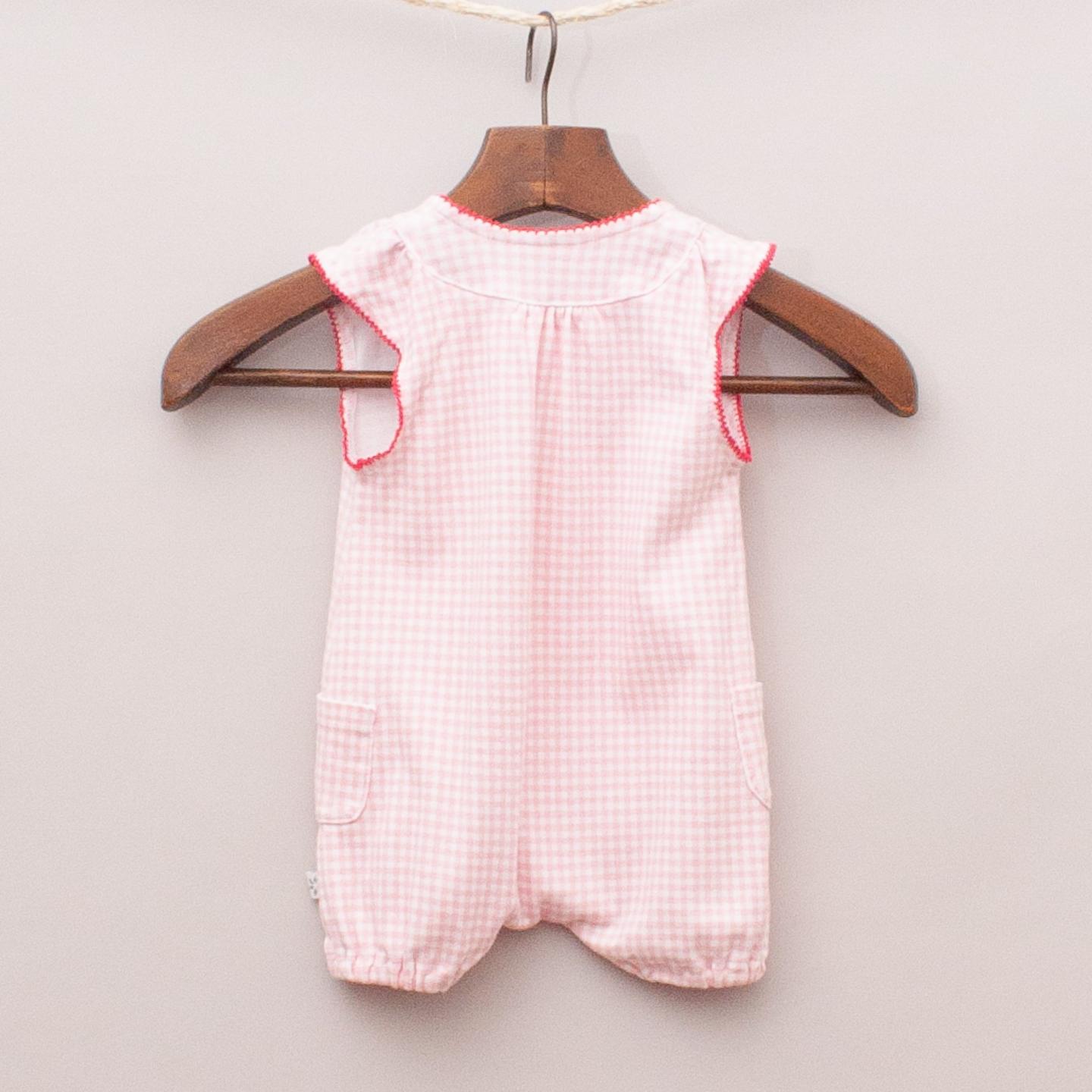 Marquise pink and white check romper with two side pockets, red trim and elastic cuffs
