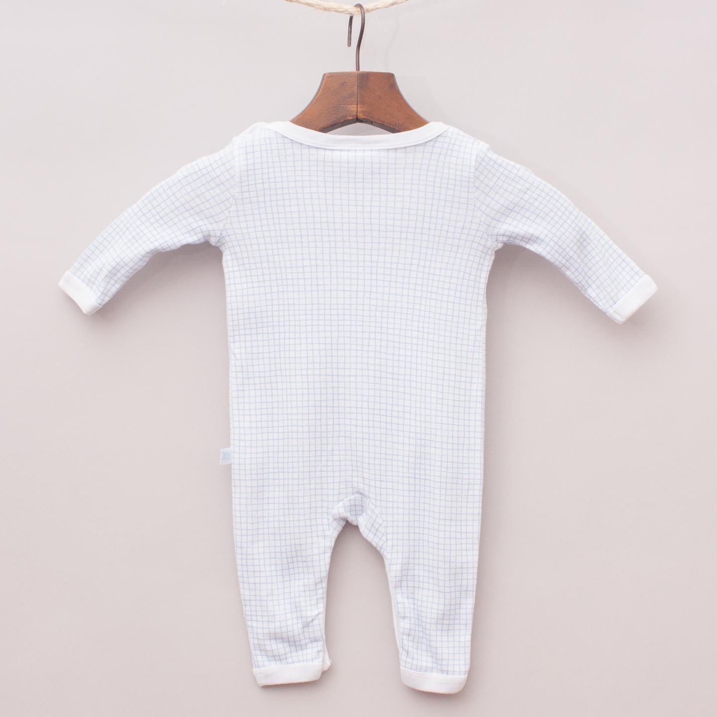 Marquise blue and white check long sleeve romper with small embroidered sail boat on the front and snap button closures *100% Cotton