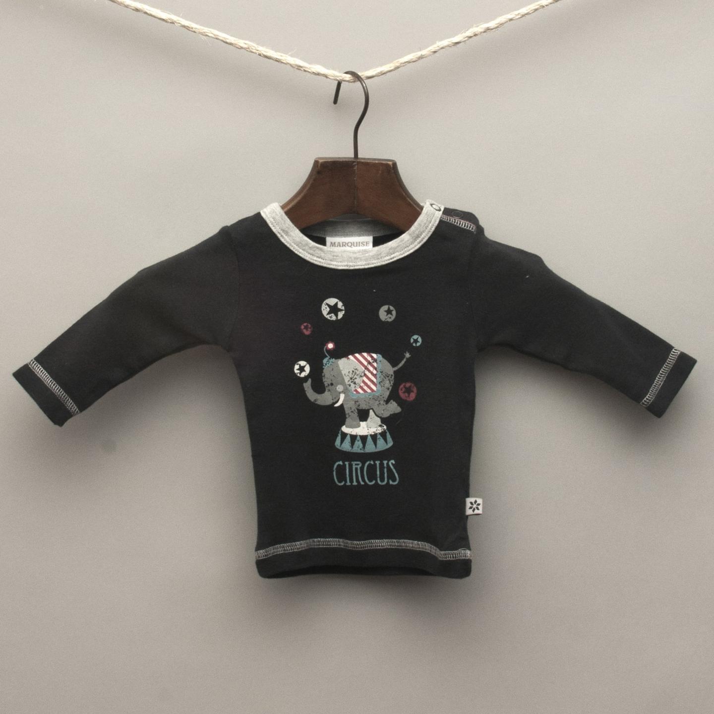 Marquise navy blue t-shirt with elephant circus motif, light grey stitching and collar detail with left shoulder button fastening