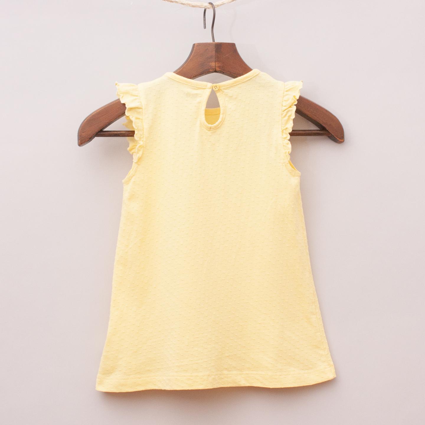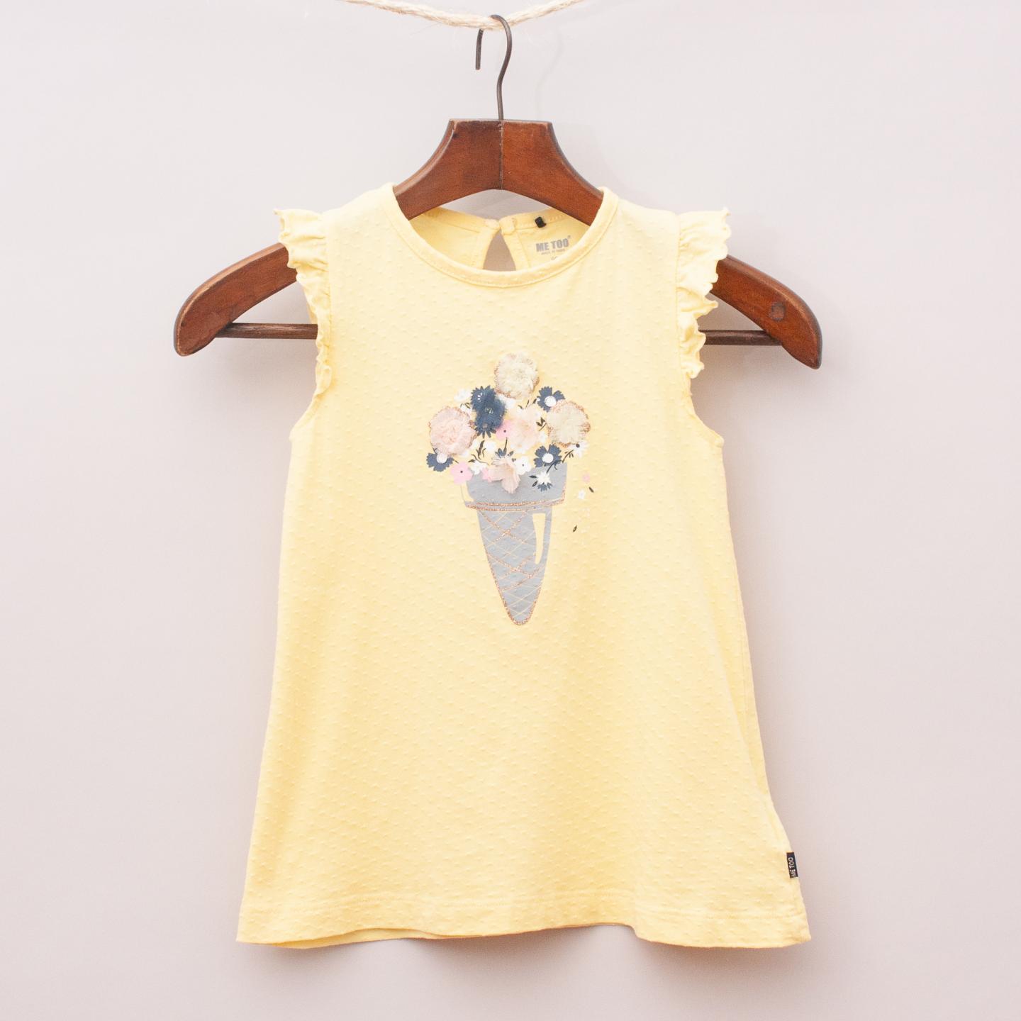 Me Too yellow textured singlet top with ruffle sleeves, fabric and printed flowers on the front and single button back closure *100% Cotton