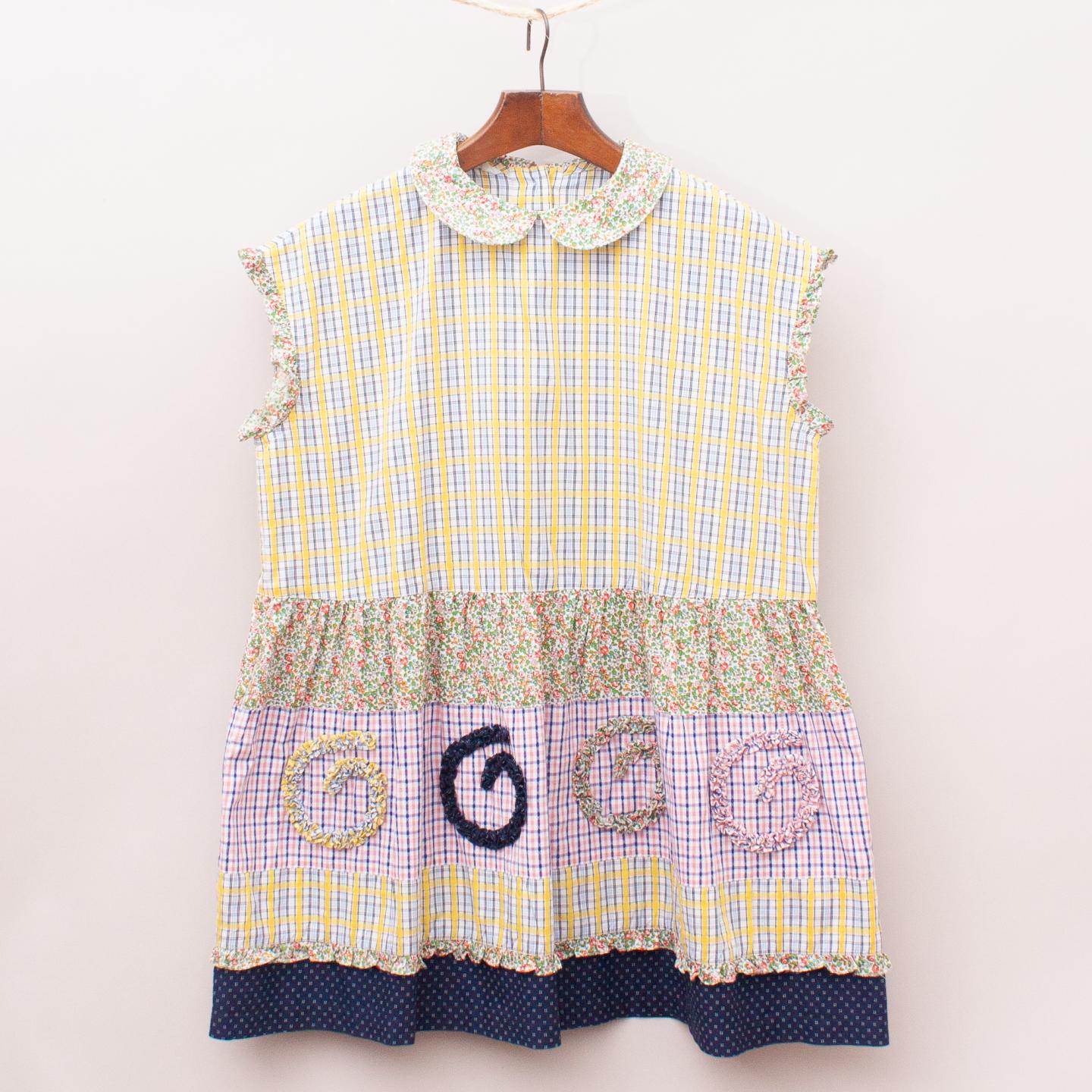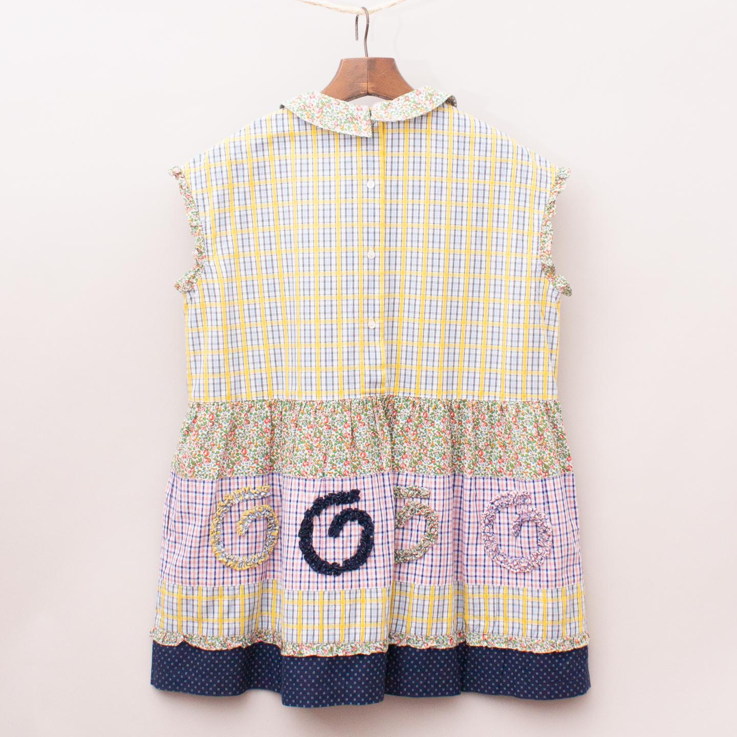 Megan Park multi coloured and multi patterned dress with ruffle edge sleeves, ruffled swirls and button down back closure *100% Cotton