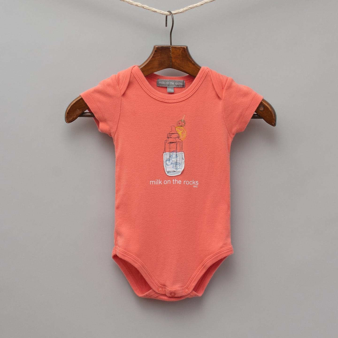 Milk On The Rocks NYC salon coloured short sleeve, legless rompers with embroidery and logo on front and crotch button closure