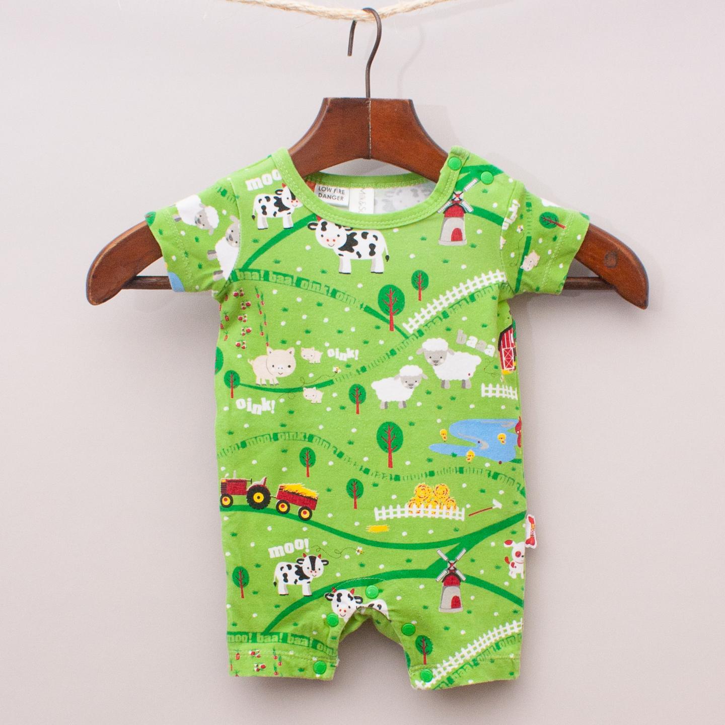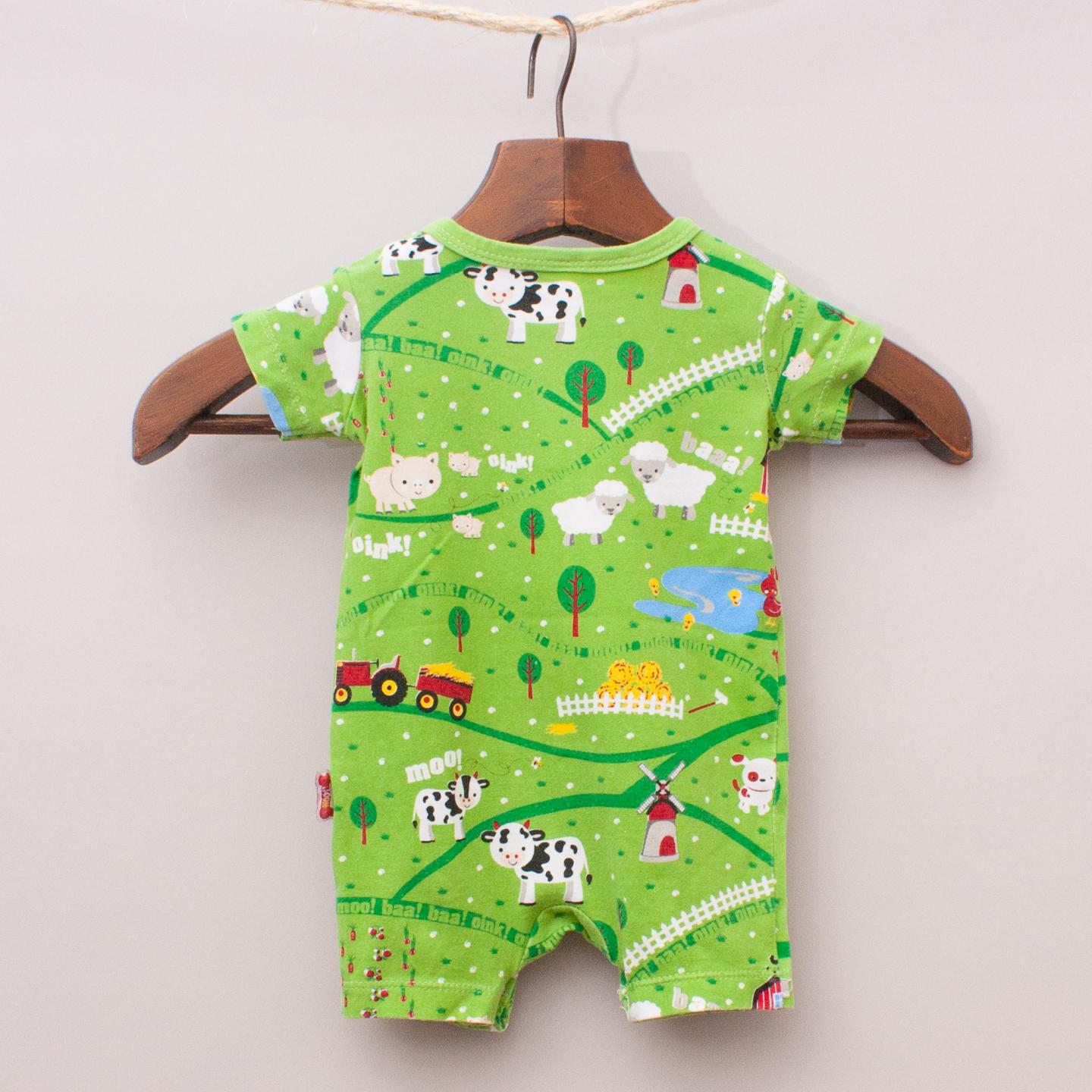 Milk & Sugar green and farm animal patterned romper with short sleeves and snap button closures *Cotton/Elastane Blend