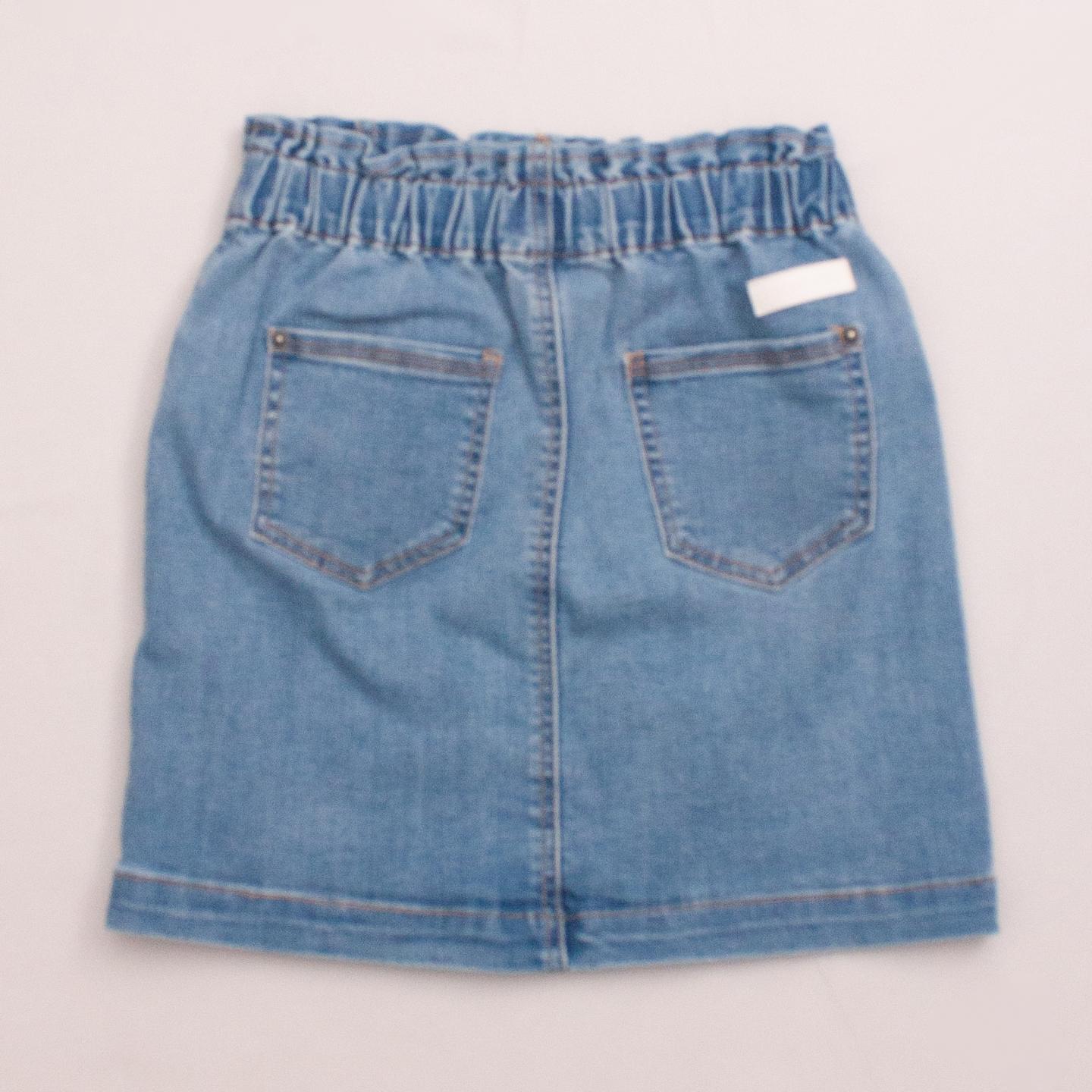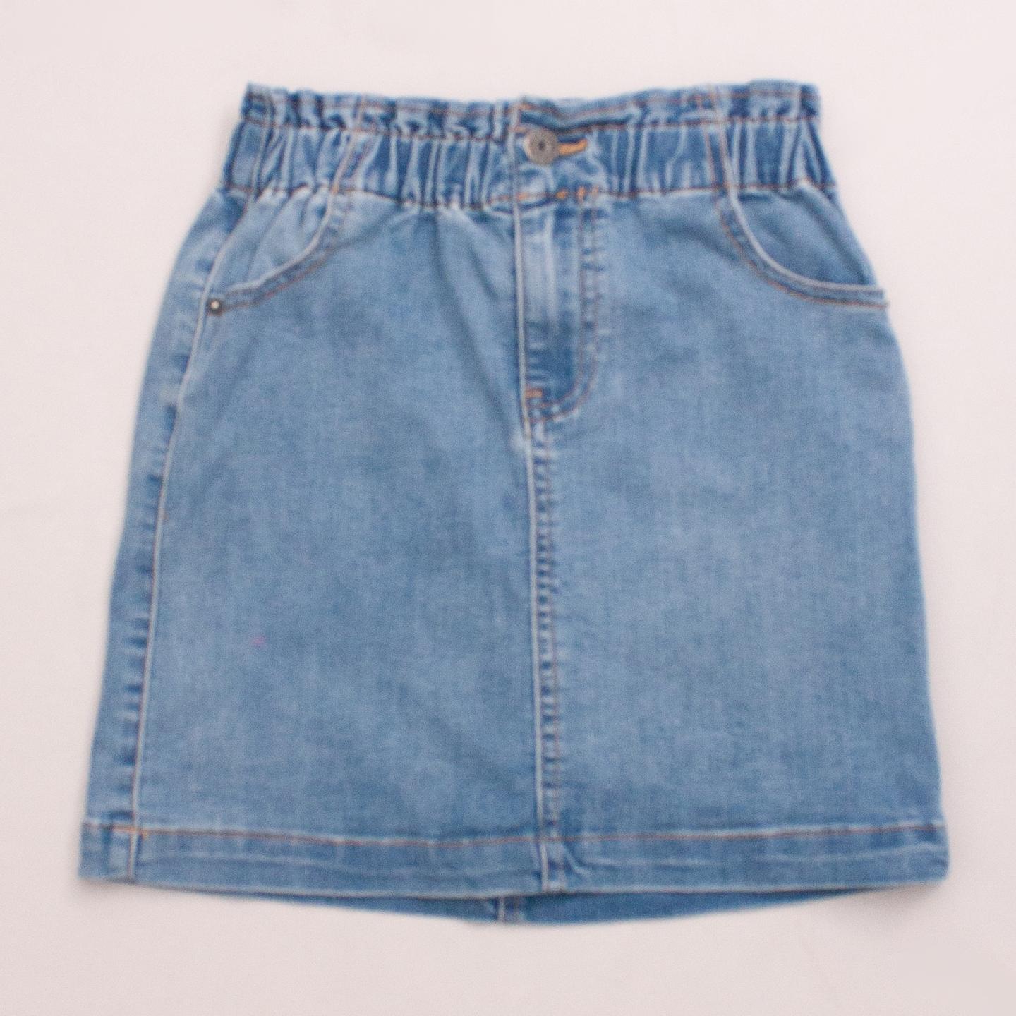 Milkshake denim skirt with front and back pockets, ruffle waistband and button/zip fastening *67% Cotton, 28% Polyester, 3% Viscose, 2% Elastane
