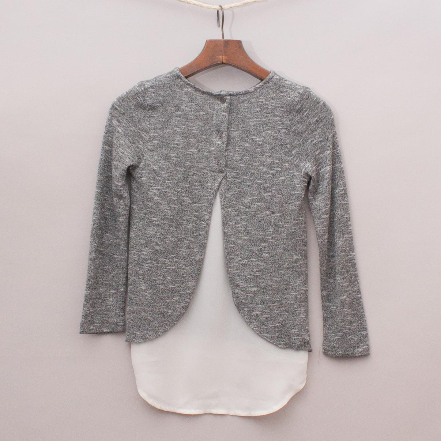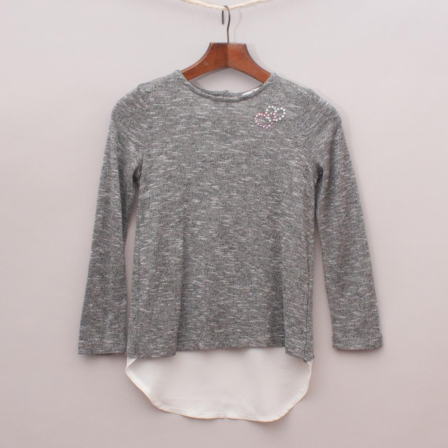 Milkshake grey marle lightweight jumper with sheer cream back detail, button closure and diamante hearts on the front