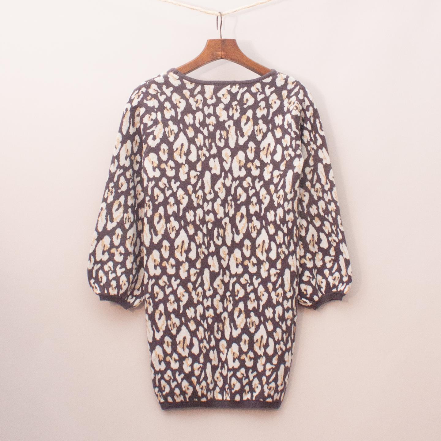 Milkshake leopard print knit long sleeve dress with wide neck collar and metallic thread throughout *93% Cotton, 5% Polyester, 2% Metallic