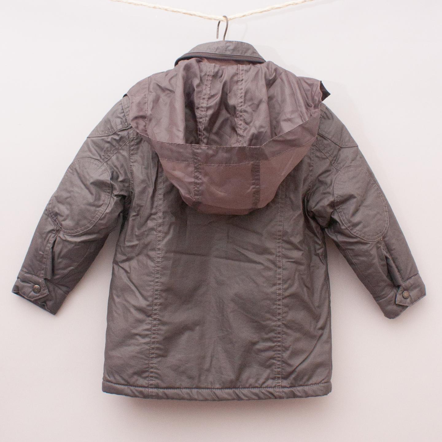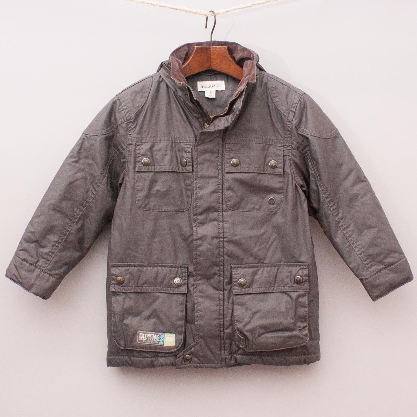 Milkshake brown padded jacket with multiple pockets, hidden hood, fleece lining and full zip/button closure *Cotton/Polyester Blend