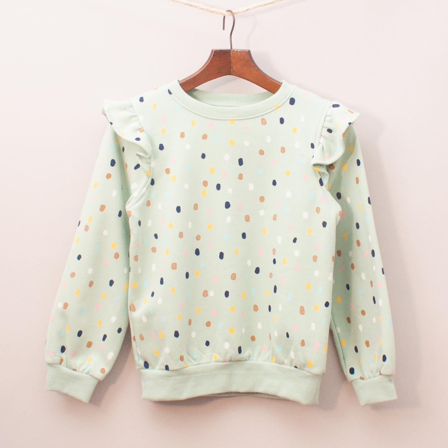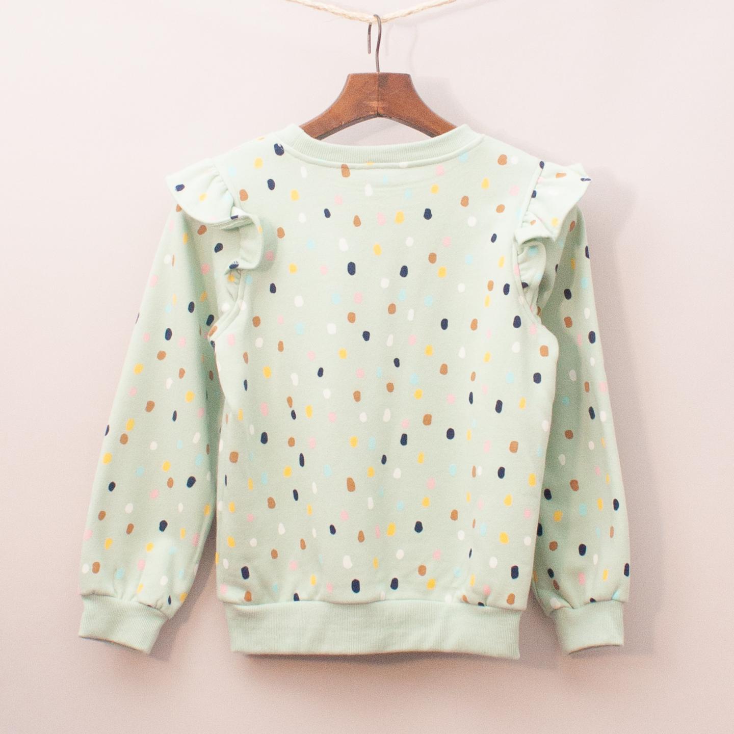 Milkshake green and multi-coloured polka dot jumper with ruffle sleeve details and ribbed neckline, cuffs and hemline *80% Cotton, 20% Polyester