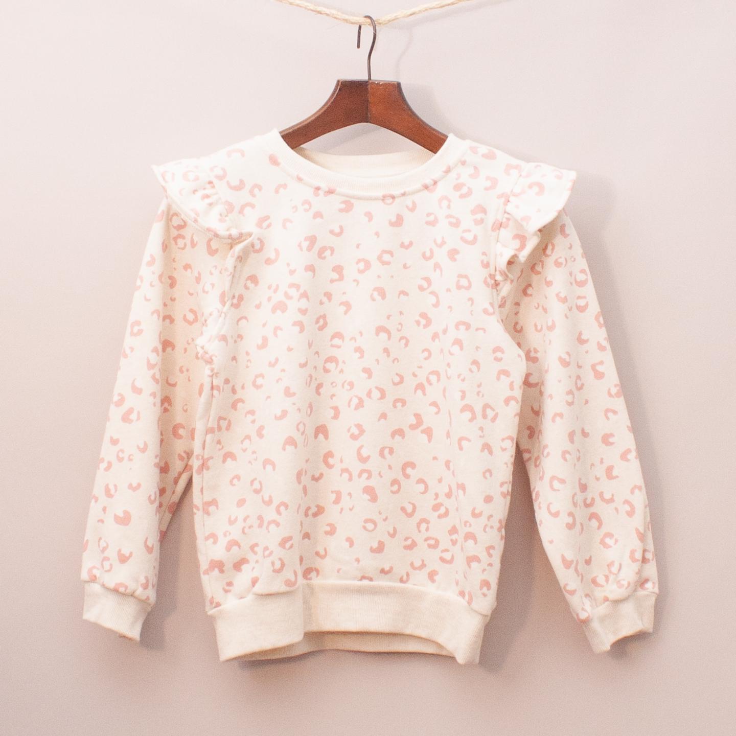 Milkshake cream and pink leopard print jumper with ruffle sleeve details and ribbed neckline, cuffs and hemline *80% Cotton, 20% Polyester
