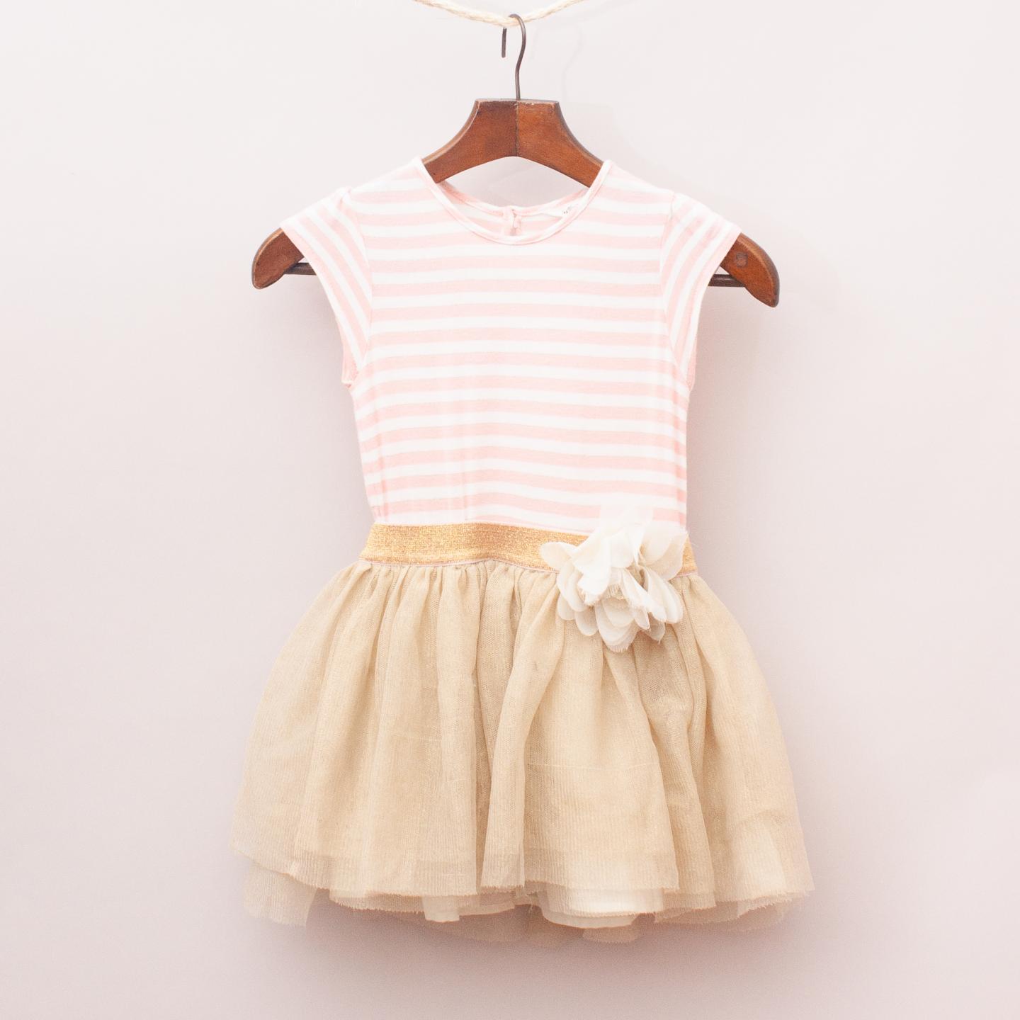 Milkshake pink and cream striped t-shirt dress with gold layered tulle skirt, fully lined with fabric flower *95% Cotton, 5% Elastane