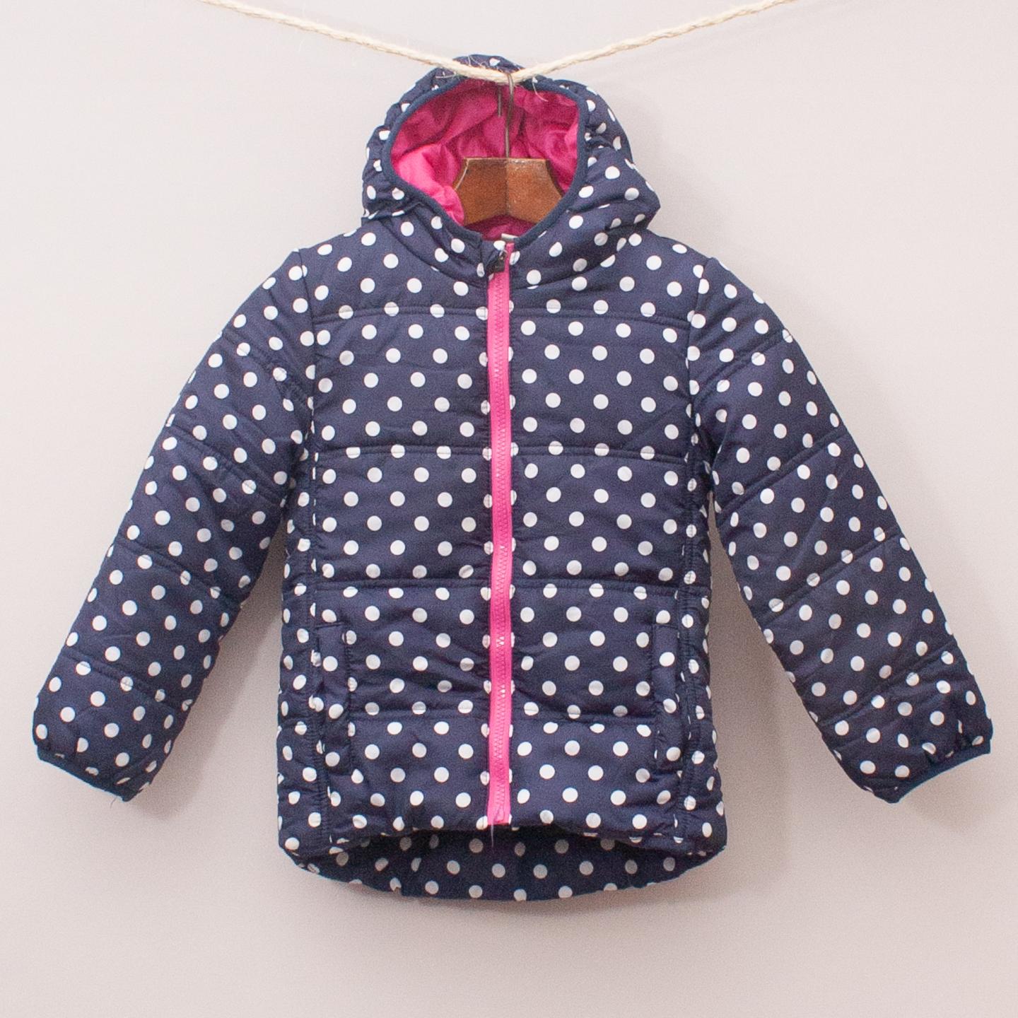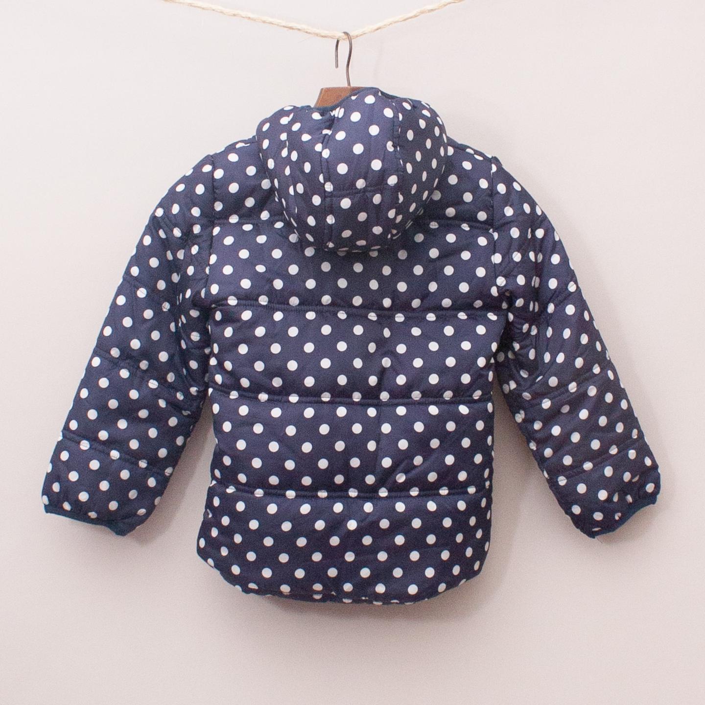 Milky navy blue and white polka dot jacket with hood two front pockets and full zip up front *100% Polyester