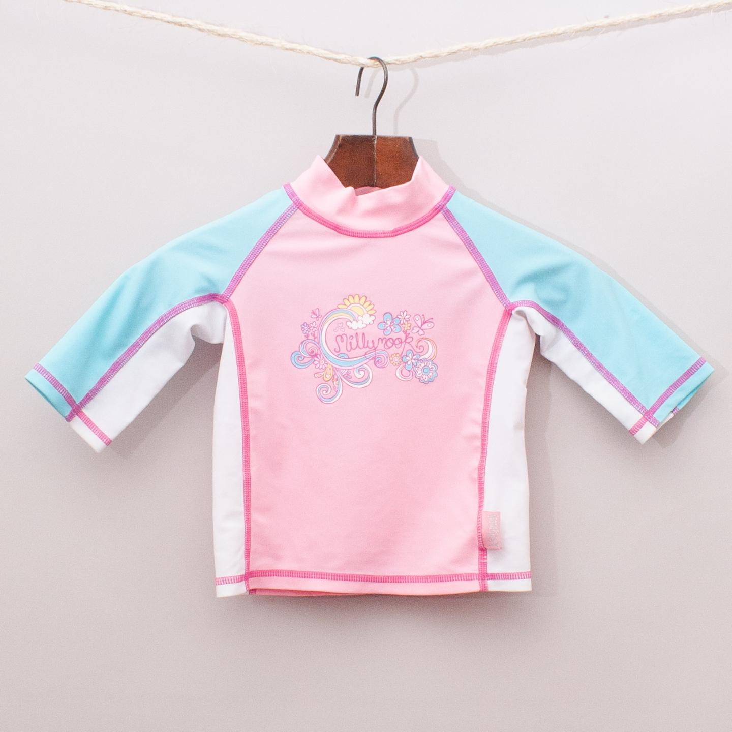 Millymook pink, white and pastel blue long sleeve rash vest with floral printed logo on the front *Small mark on the back under near underarm