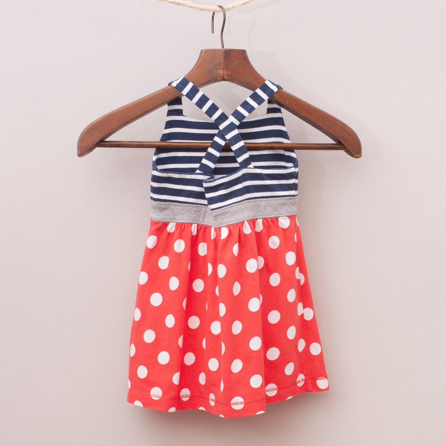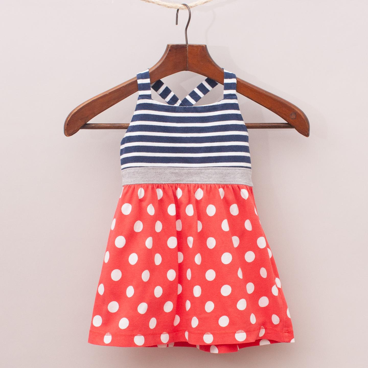 Mini Boden blue and white striped dress with pink and white polka dot flippy skirt - 100% Cotton